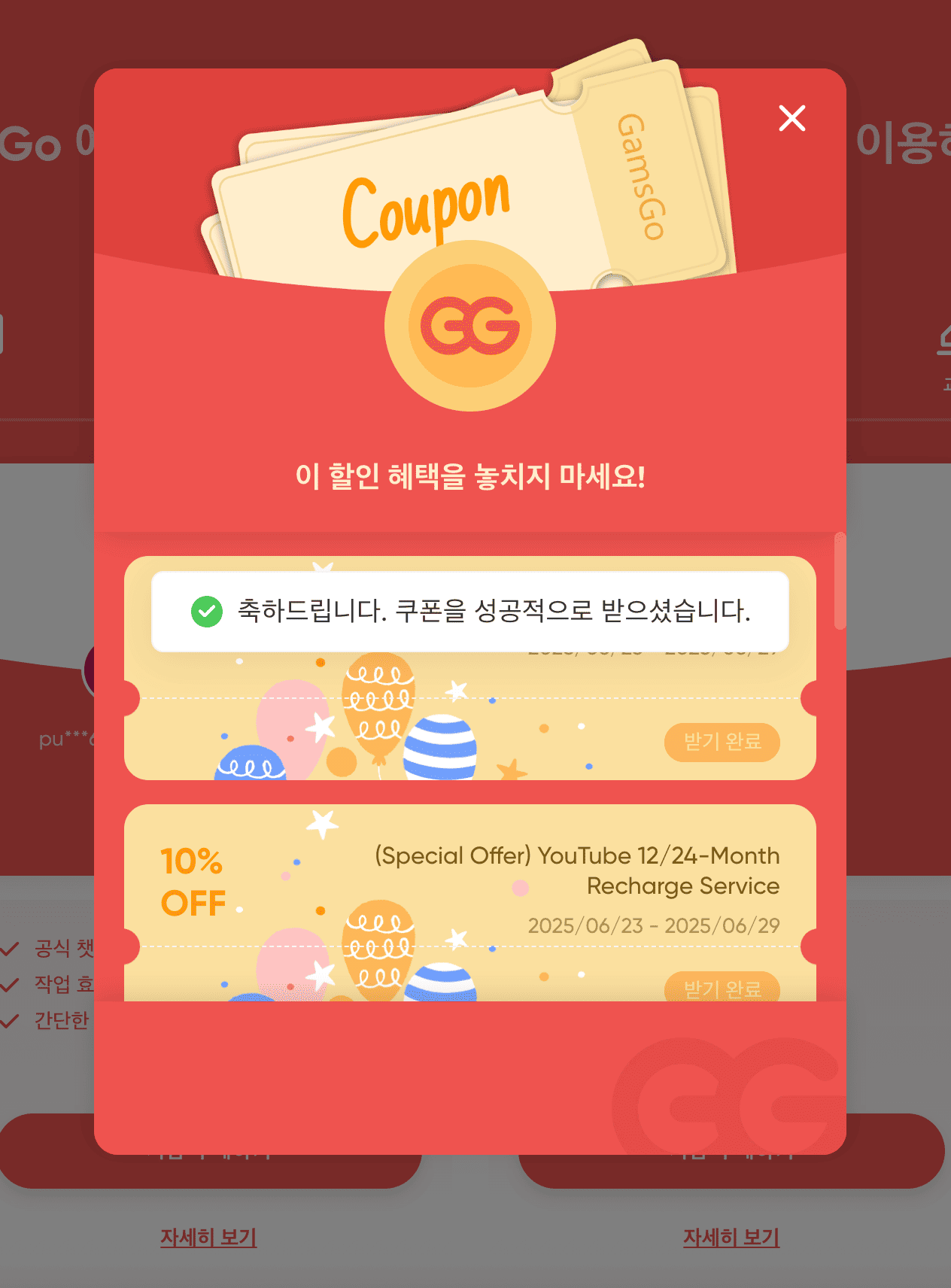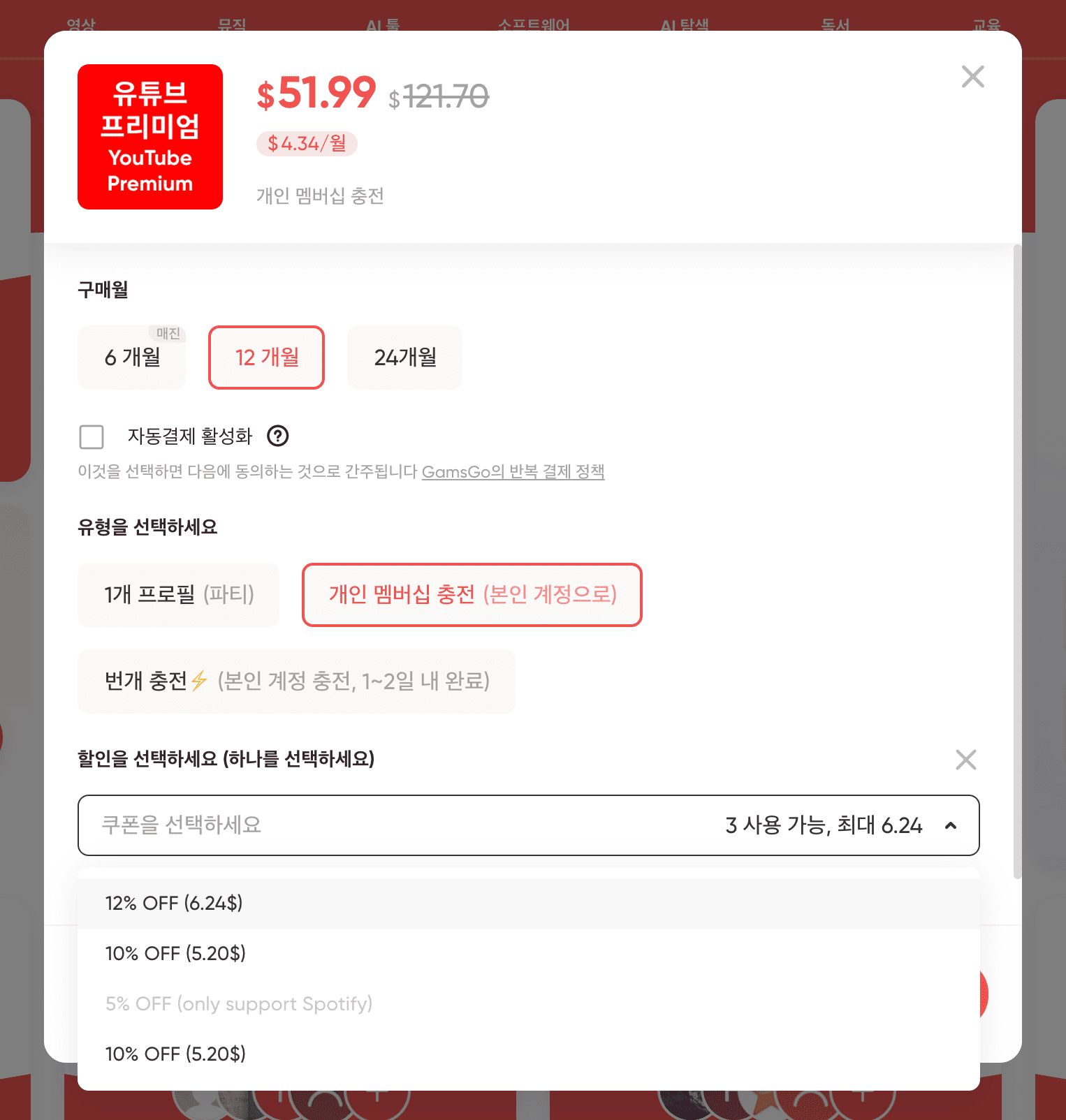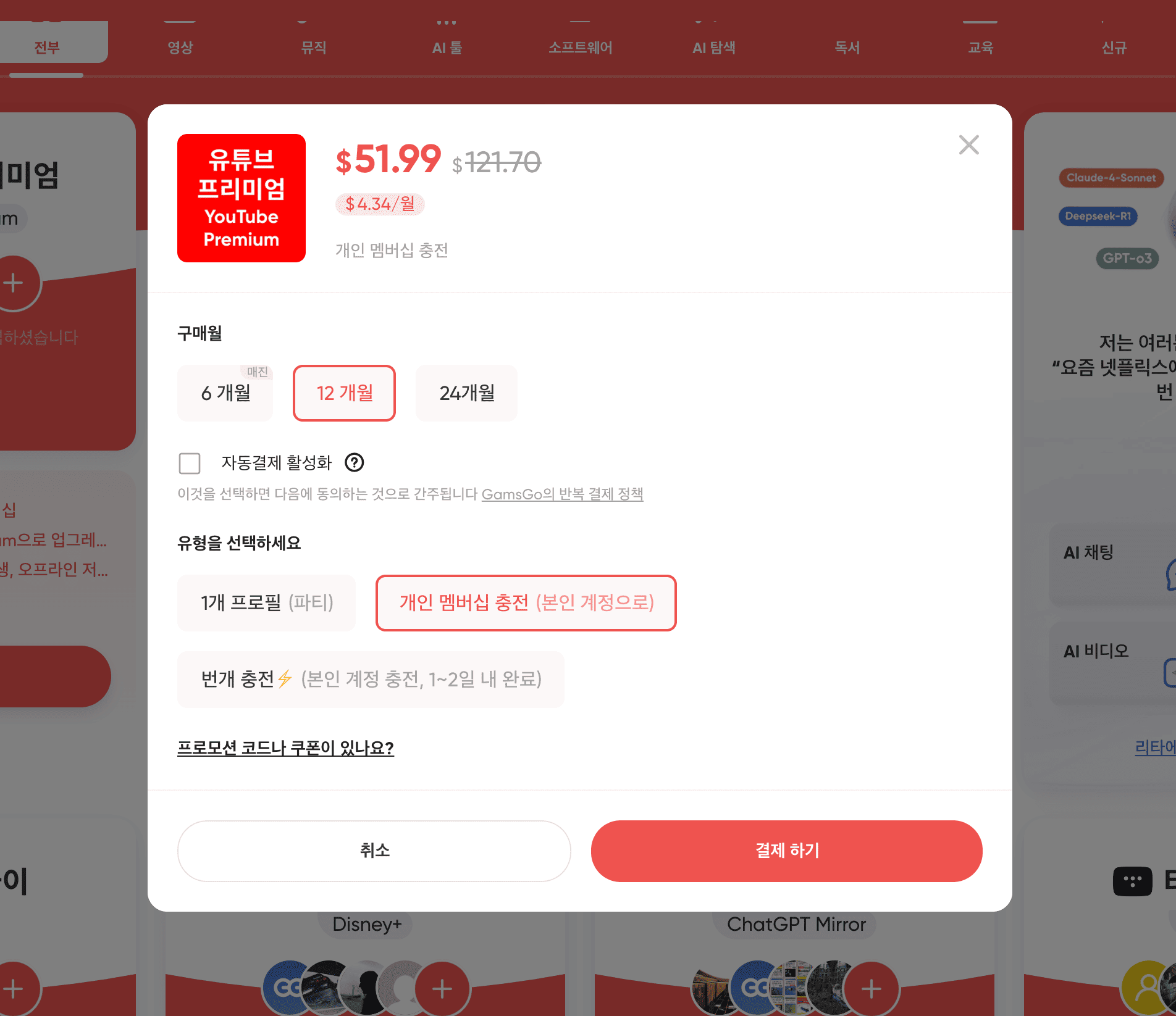 구글이 2024년부터 가족 플랜 지역 제한·무단 공유 단속을 강화하면서, 기존 ‘가족 그룹 초대’ 방식이 자주 차단되는 문제가 발생했습니다. 이에 겜스고는 공식 YouTube Premium Individual Plan을 고객 개인 계정에 직접 충전하는 대안을 도입했습니다.