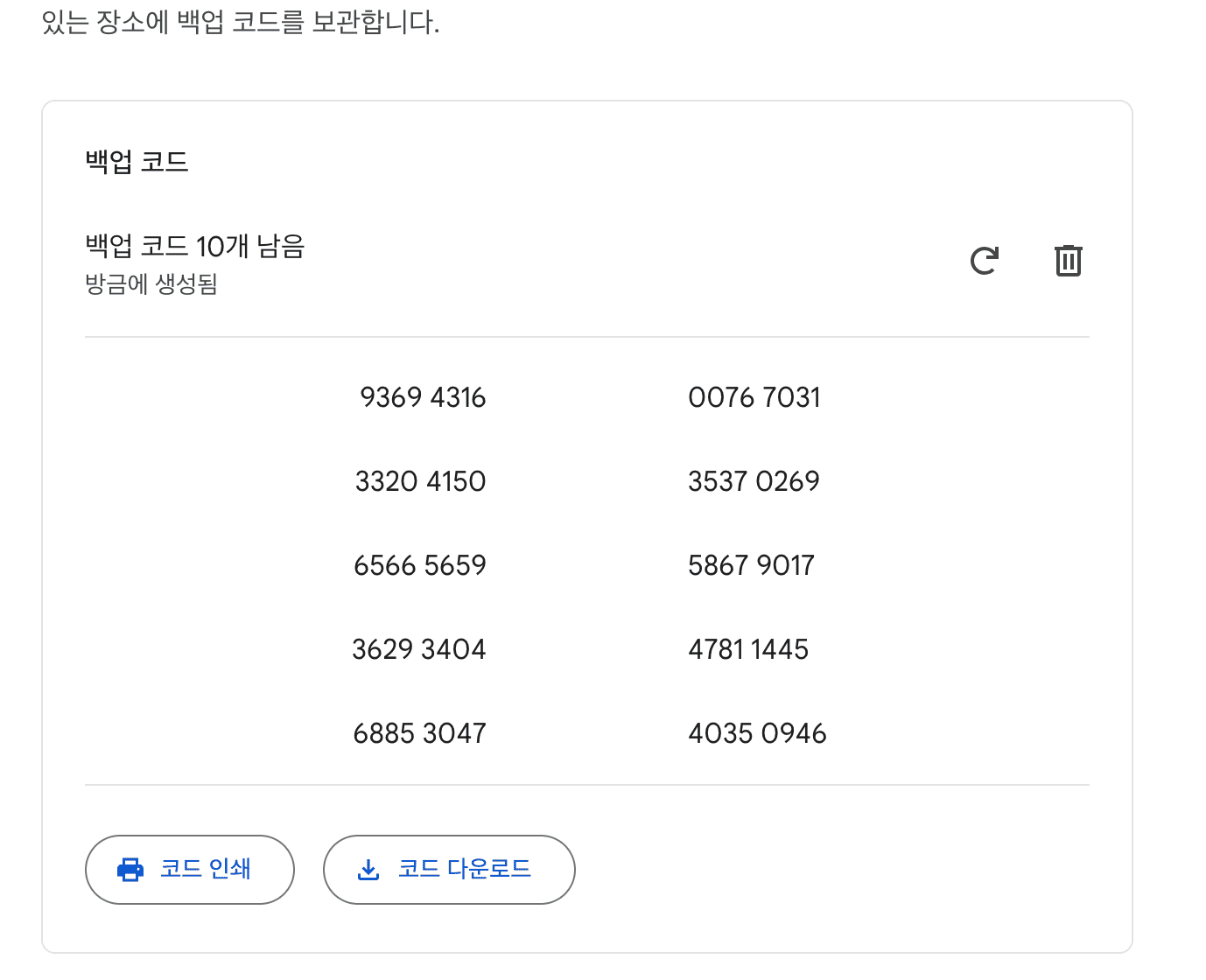 페이지에서 하라는 데로 하면 아래와 같이 여러 개의 백업코드가 나오는데요. 아래 10개 중에 3개만 기입하시고 제출하시면 끝입니다.