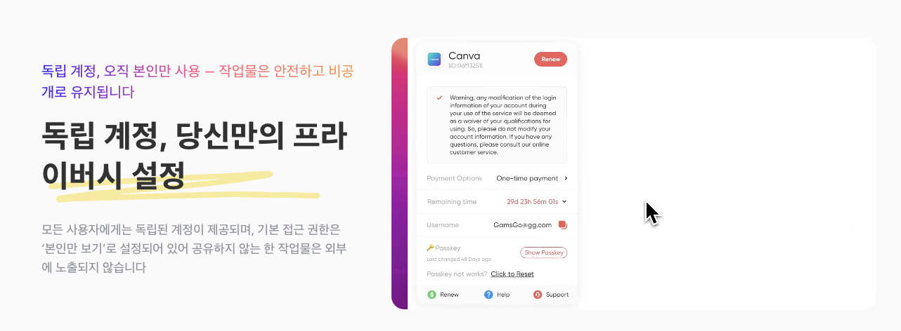 1년으로 계산하면 약 3만 원 정도 절약되는 셈입니다. 굳이 몇만원 때문에 해야되냐는 생각이 있으실텐데, 해야되는 이유는 겜스고는 캔바 구독 시 단독 계정을 배급합니다.