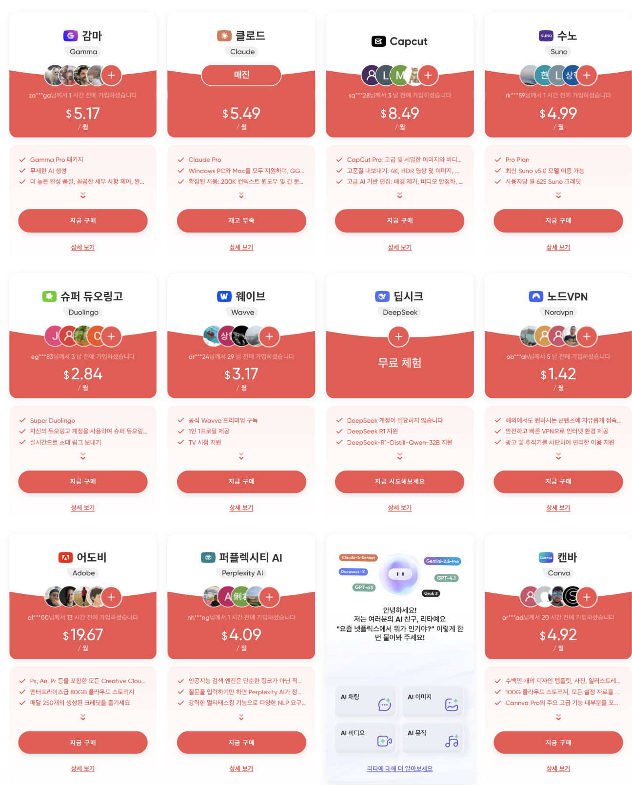 겜스고는 캔바뿐만 아니라, 챗지피티, 감마AI, 클로드, 딥시크, 그록 등 대부분의 AI 툴을 구독할 수 있습니다. 아래 이미지에서 확인해보시고, 사이트를 들어가시면 더 많은 플랫폼을 만나실 수도 있습니다.