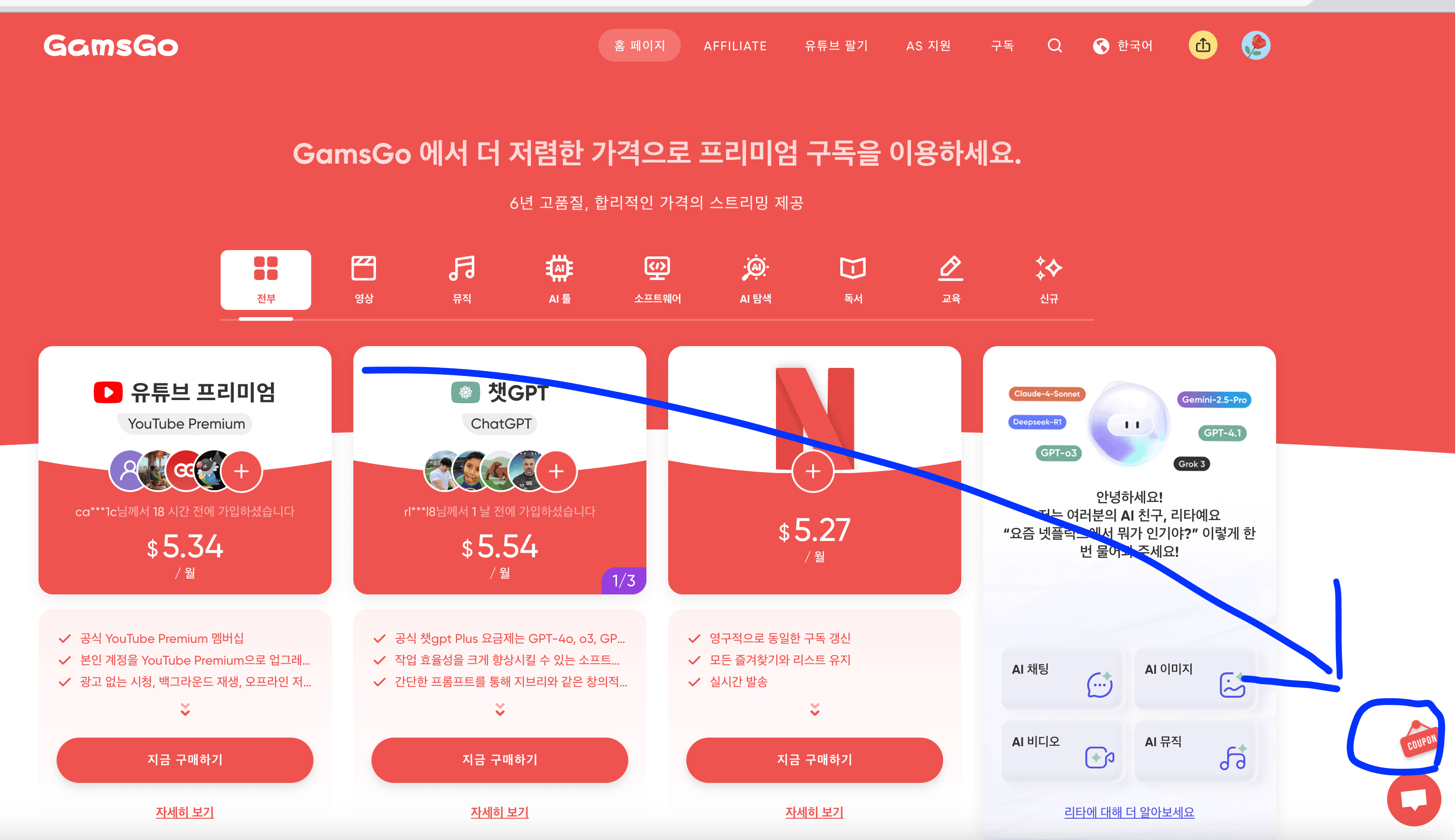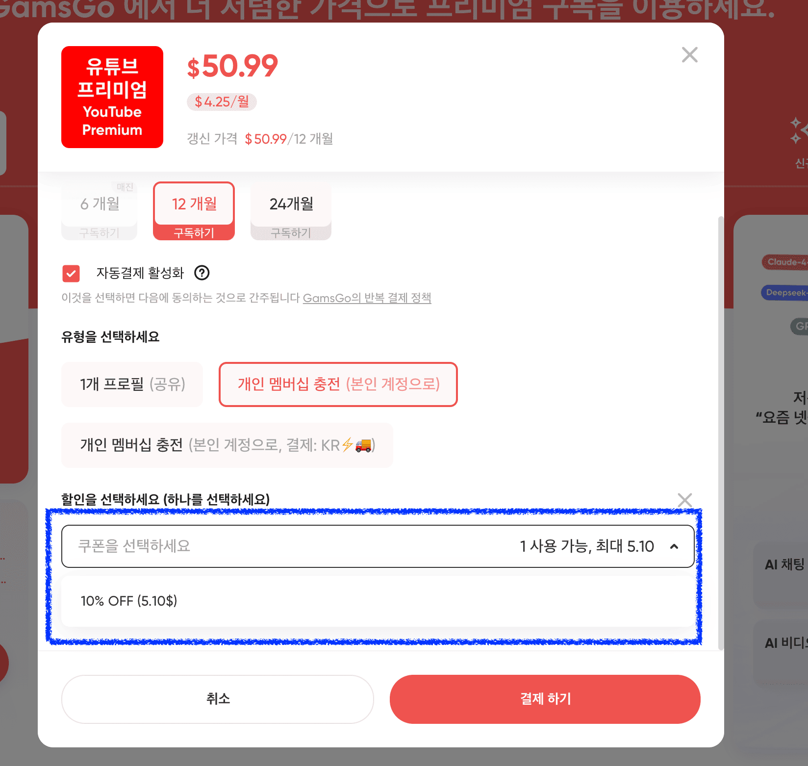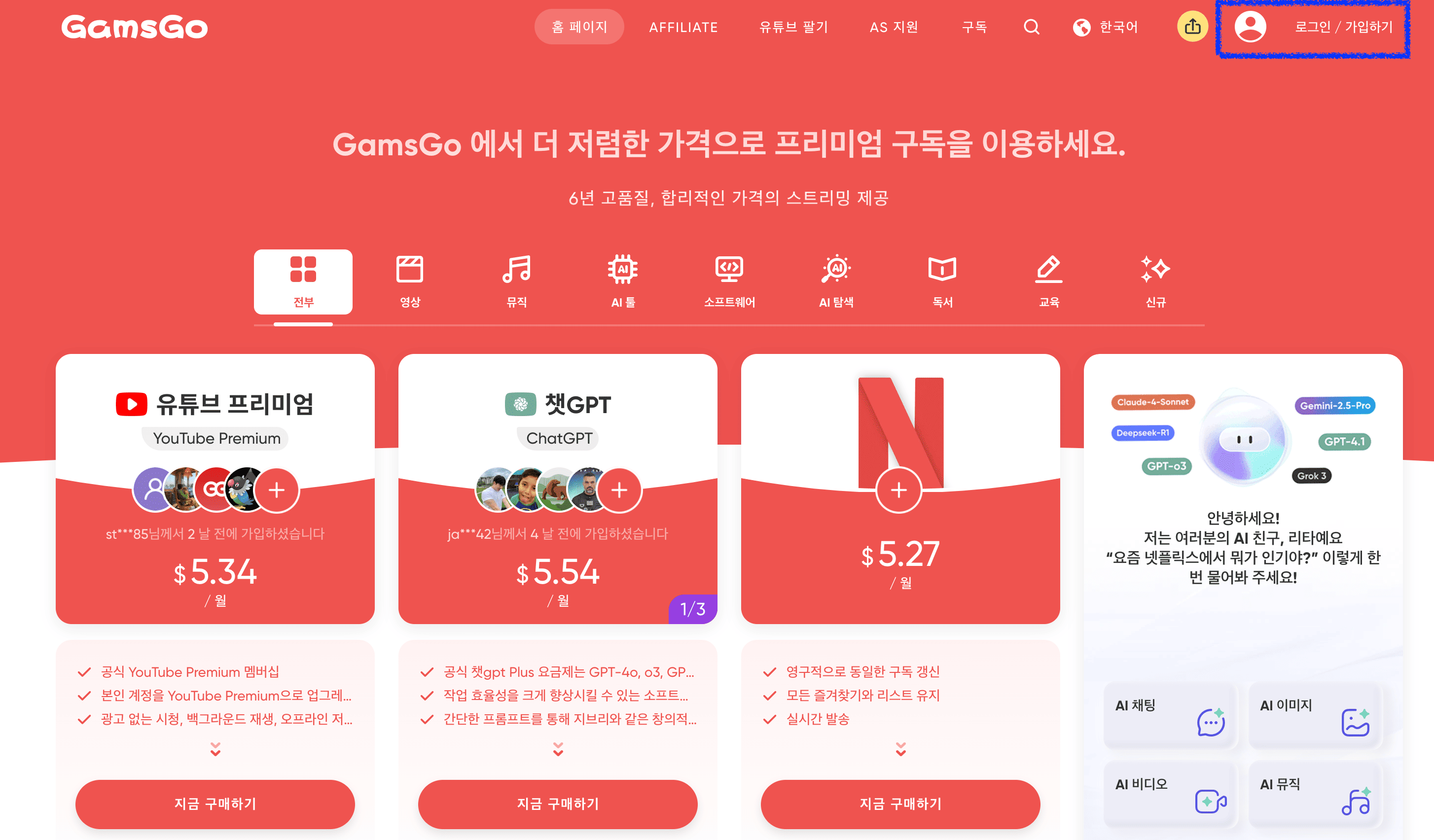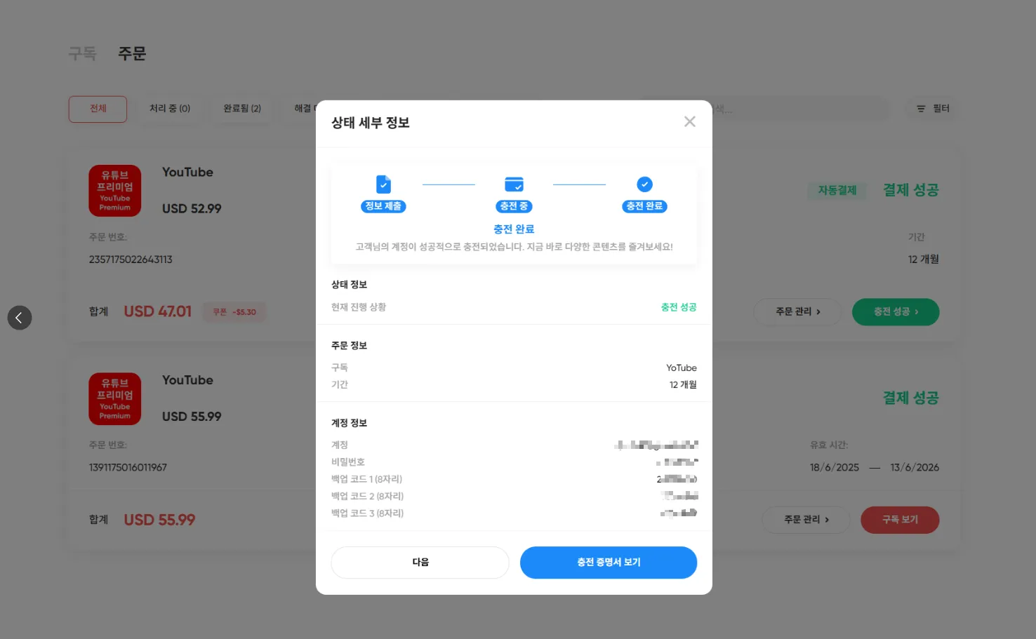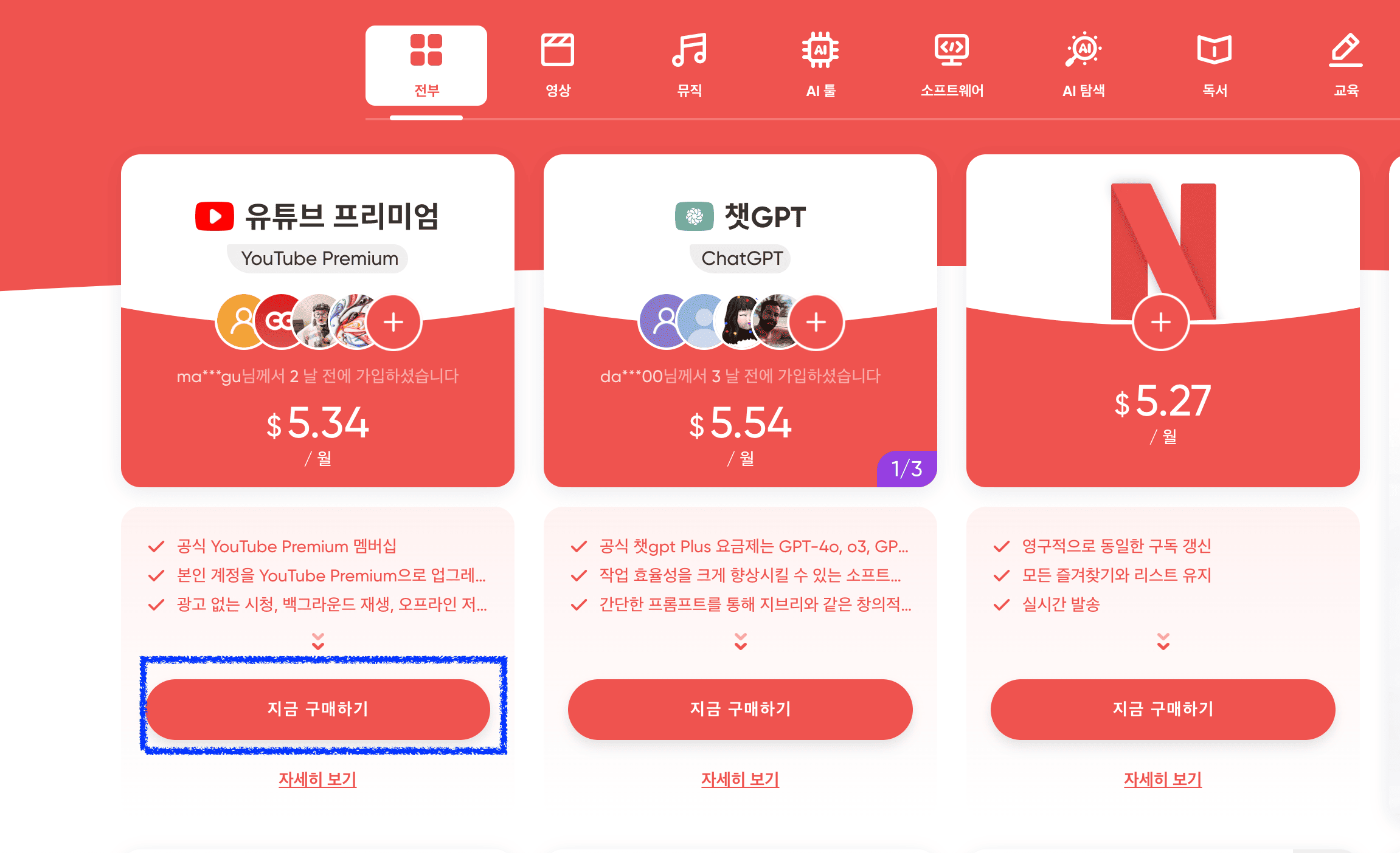 유튜브 프리미엄·ChatGPT Plus처럼 가족 플랜이 까다로운 서비스는 고객 개인 계정에 1·3·12 개월권을 직접 충전합니다. 비밀번호를 공유할 필요가 없어 보안 부담이 적습니다.