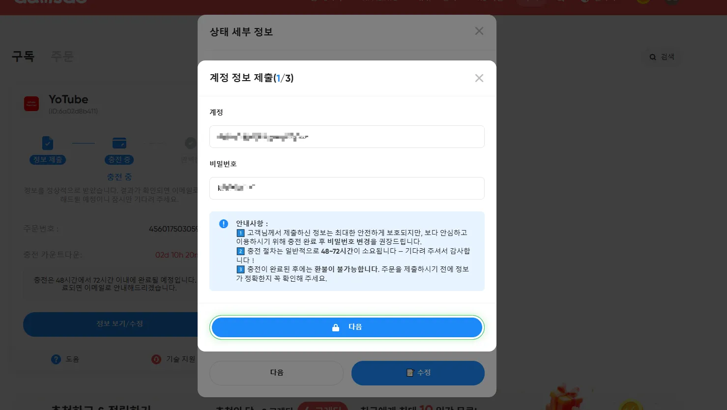 2가지의 차이는 바로 처리되는 속도의 차이인데요. 어떤 게 처리가 되냐 하면은 개인 계정으로 충전되는 서비스다 보니 결제 후, 본인의 유튜브 계정을 결제 후 비고란에 작성하게 됩니다.