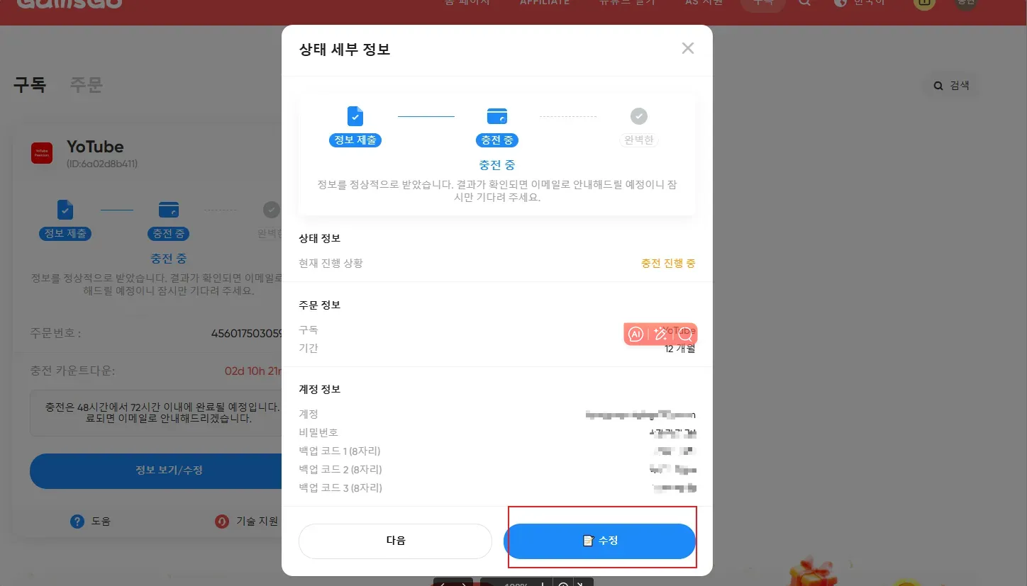 추가로 결제를 하게 되면, 겜스고에서 요청하는 사항 3가지가 있습니다. 아이디 및 비밀번호와 8자리 백업 인증 코드입니다. 이 부분은 결제 후에 자세하게 설명이 되어 있으니, 참고하시면 됩니다.