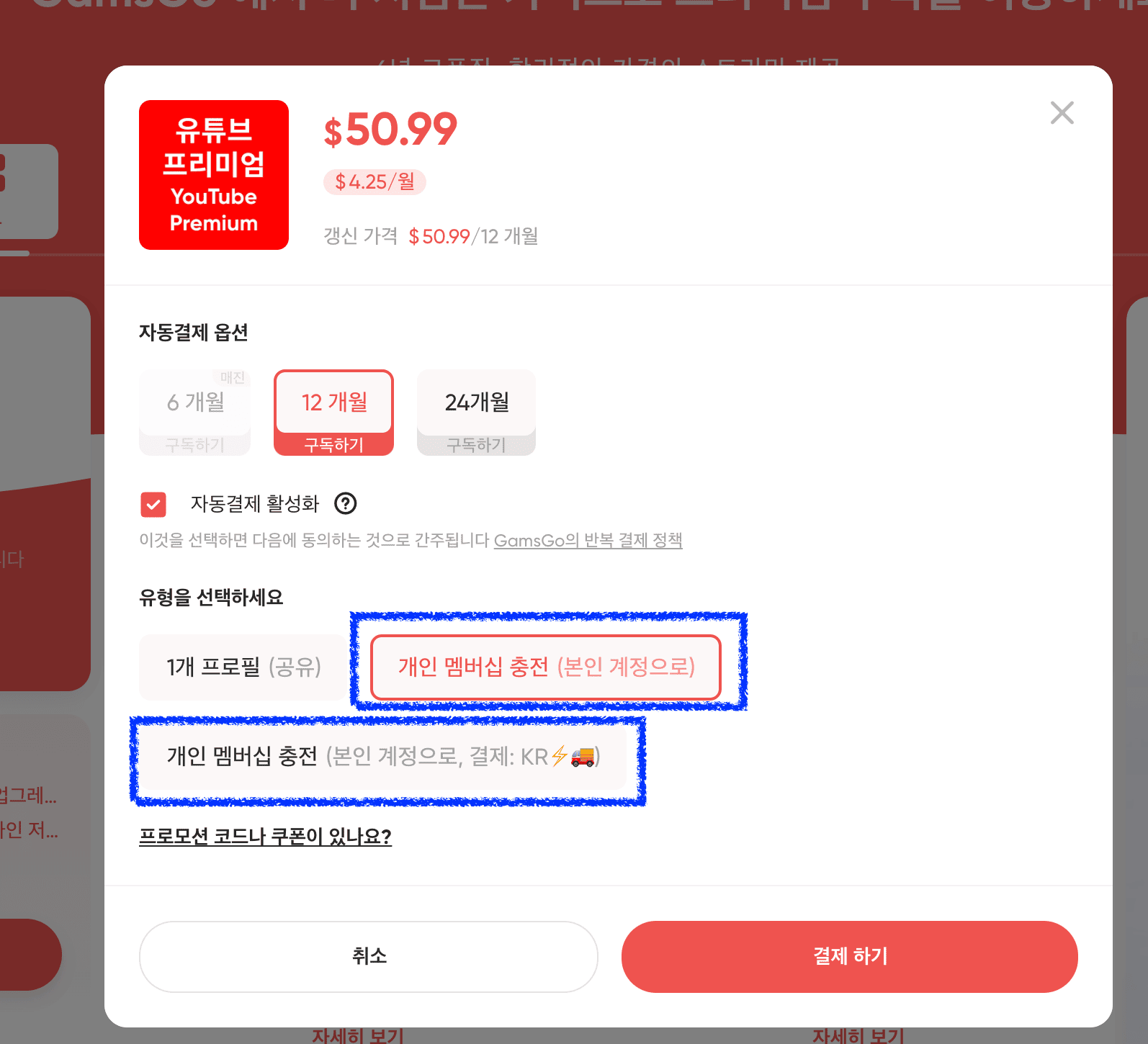 이제 거의 다 왔습니다. 유튜브 프리미엄의 [지금 구매하기]를 클릭하시고 [개인 멤버십 충전]을 클릭합니다. 근데 이상한 부분이 있죠? 멤버십 충전에 2가지가 있습니다.