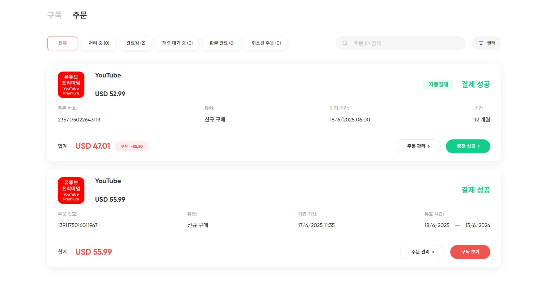 결제 후에 아래와 같이 주문란에서 결제 내역을 확인할 수 있습니다.