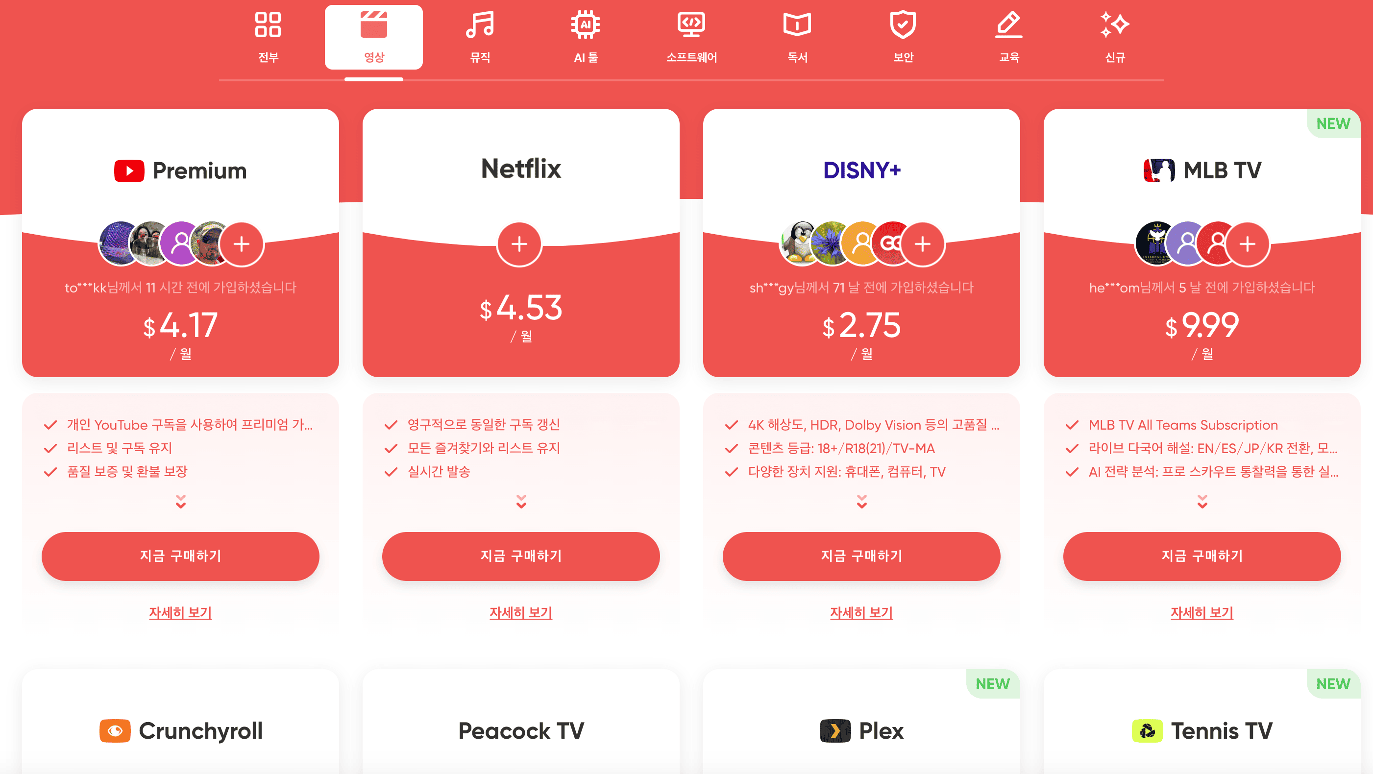 넷플릭스·디즈니+·스포티파이처럼 최대 6인까지 허용하는 요금제를 공식 가격으로 구매한 뒤 좌석을 나눕니다. 각자 프로필을 이용하므로 시청 기록이 섞이지 않습니다. - 개인 계정 직접 충전