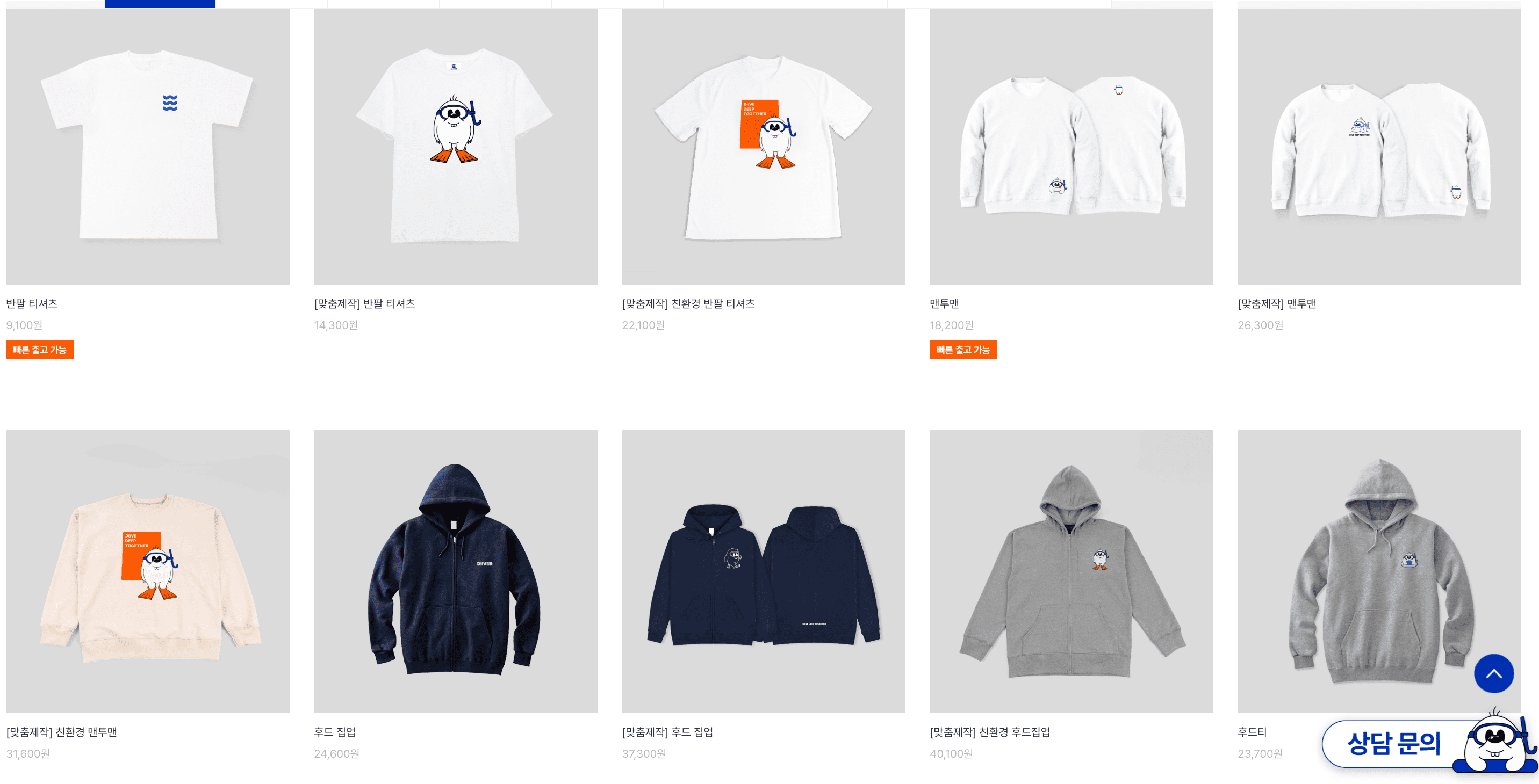 반팔 티셔츠: 친환경 소재로 제작된 기본 티셔츠. 로고나 메시지를 인쇄 가능 / 가격: 기본형 10,000원/개부터(소량 주문 시 가격 상승).