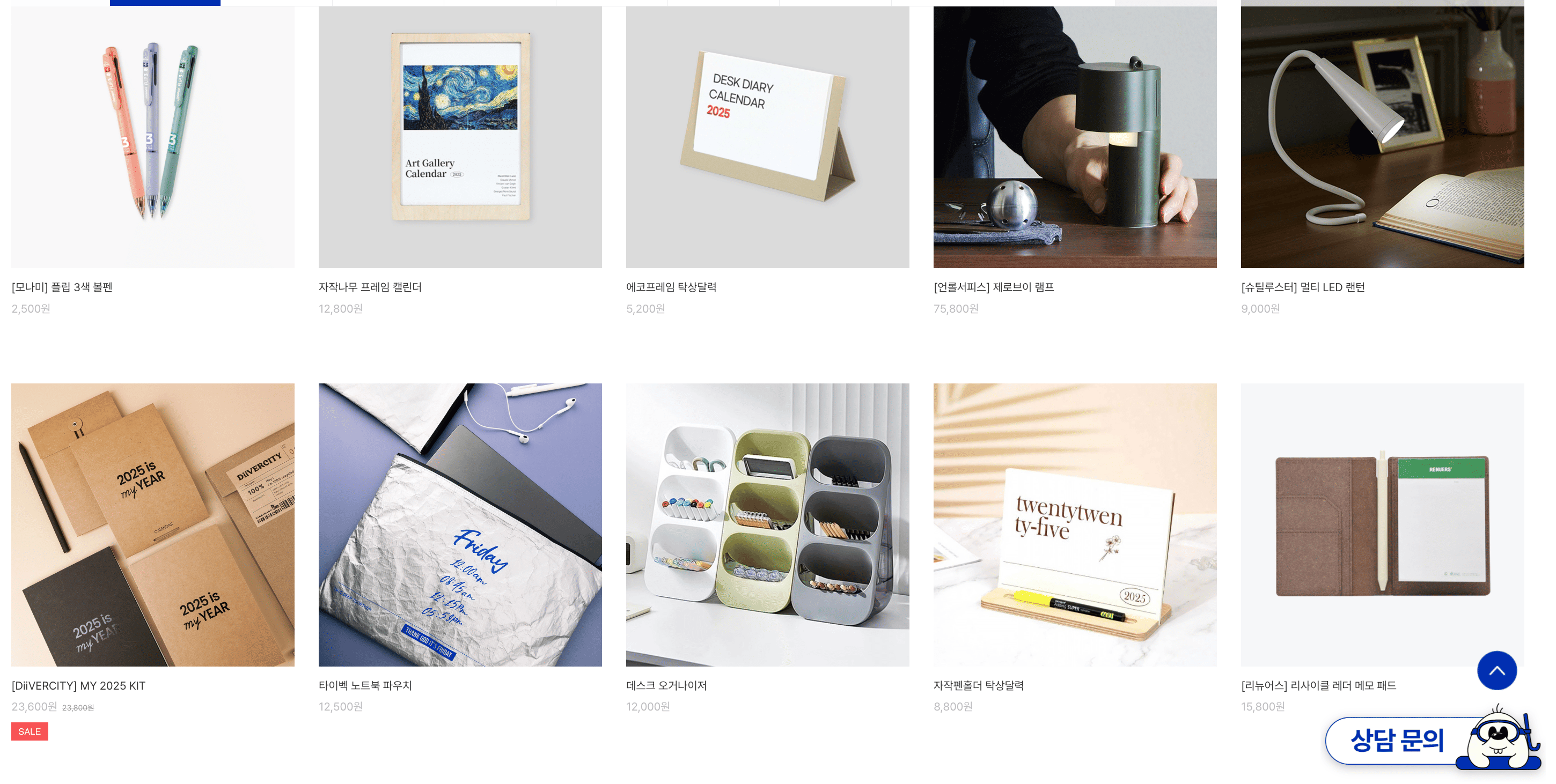 - 다이어리: 슬로건 다이어리(8,800원), 프리미엄 다이어리(12,400원) 등, 기업의 브랜드 메시지를 담을 수 있는 맞춤형 제품.