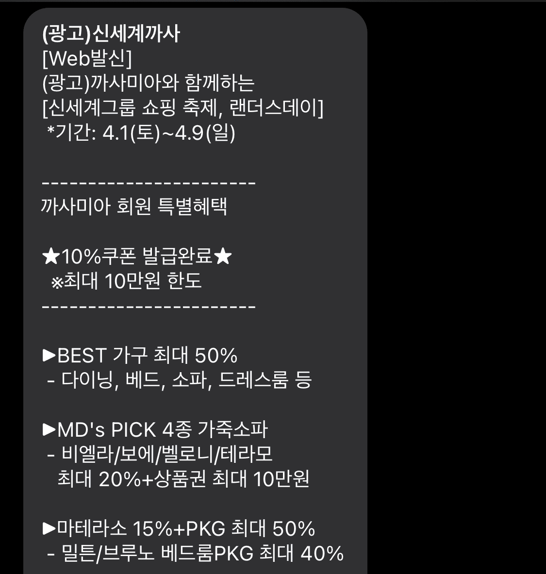 까사미아 회원가입 후 마케팅 수신 동의를 하면, 까사미아에서 매월 1~2회 정도 행사 내용을 보내줍니다. 꽤 주기적으로 중복할인 적용 쿠폰을 보내주니, 구매 몇 달 전에 문자를 보며 혜택을 기다리시는 것도 방법입니다.
