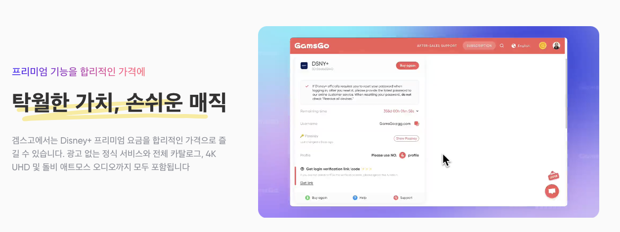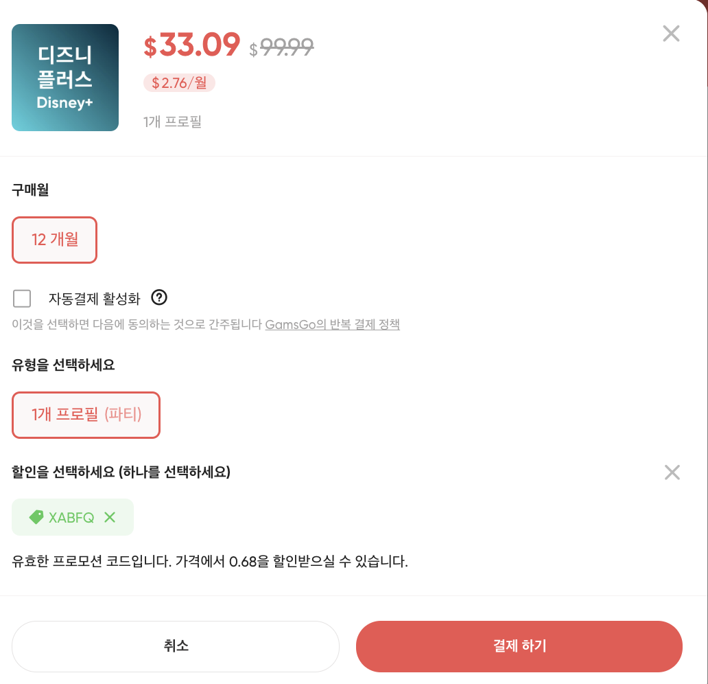 많은 분들이 궁금해하십니다. 쿠폰 코드(XABFQ)를 입력하고 결제를 완료하면, 겜스고 대시보드에서 계정 충전 상태를 확인할 수 있습니다. 이메일 안내도 함께 오며, 바로 디즈니 앱에 로그인하면 프리미엄 기능이 활성화됩니다.