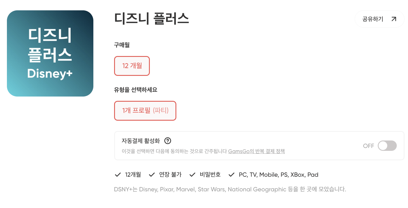 저는 디즈니 플러스를 월 3천 원대에 쓰고 있습니다. 연간으로 따지면 약 10만 원 가까이 절약했습니다. 한달에 커피 한 잔 차이 일지는 모르겠지만, 다른 OTT까지 겜스고로 저렴하게 구독하신다면