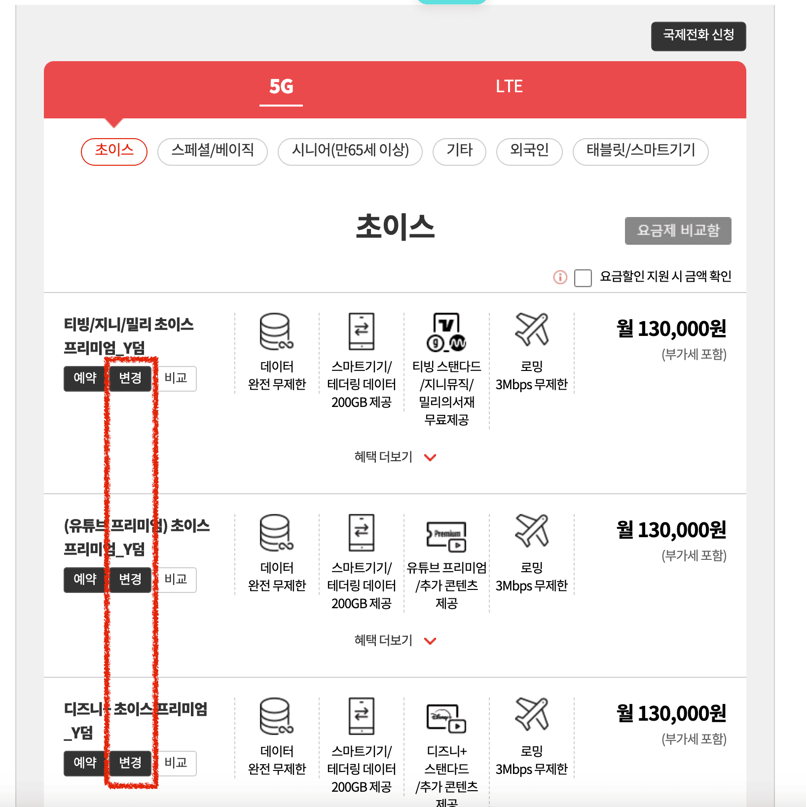 여기서 전에 찾아 놓으신 요금제를 검색하시고 변경을 누르시면 됩니다.