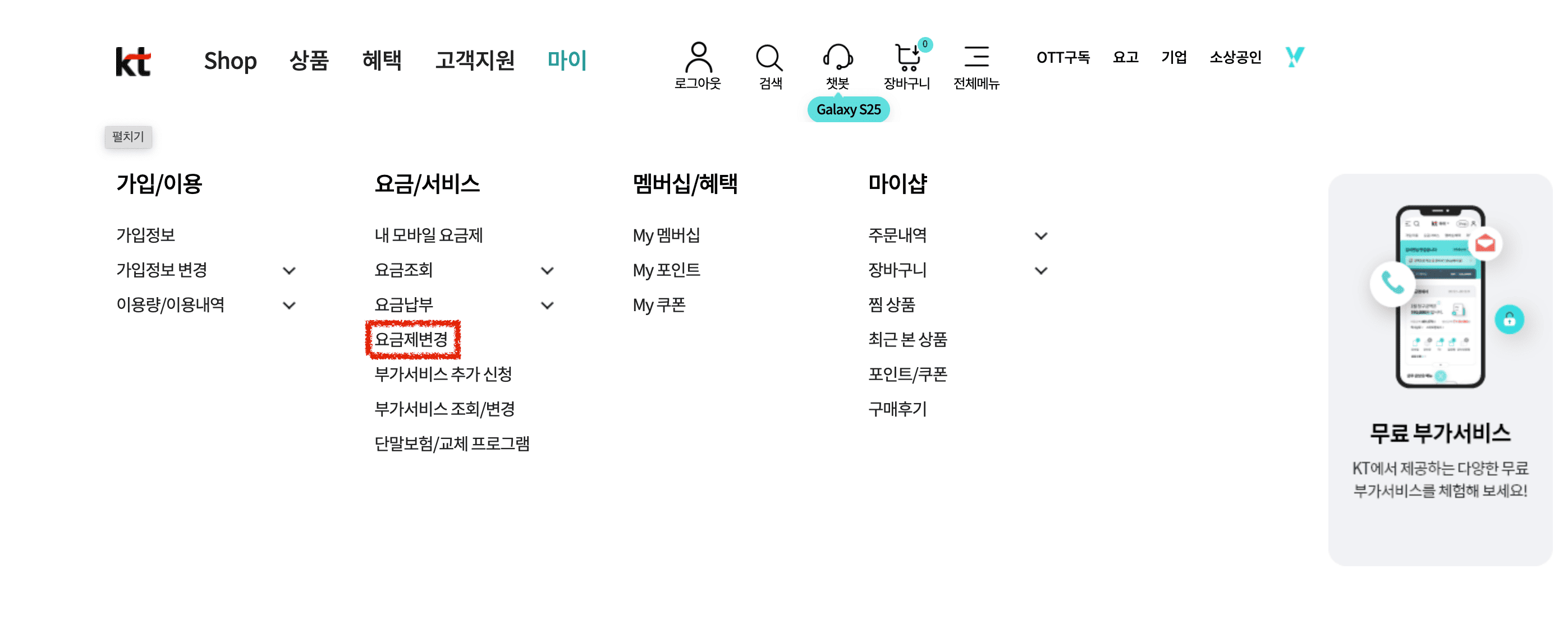 물론 이거 전에 로그인이 우선입니다. 그러면 [요금/서비스] 란에 [요금제 변경]란이 있습니다. 이걸 누르시면 되는데요 그렇게 되면 가장 우측 표가 보이실 겁니다.