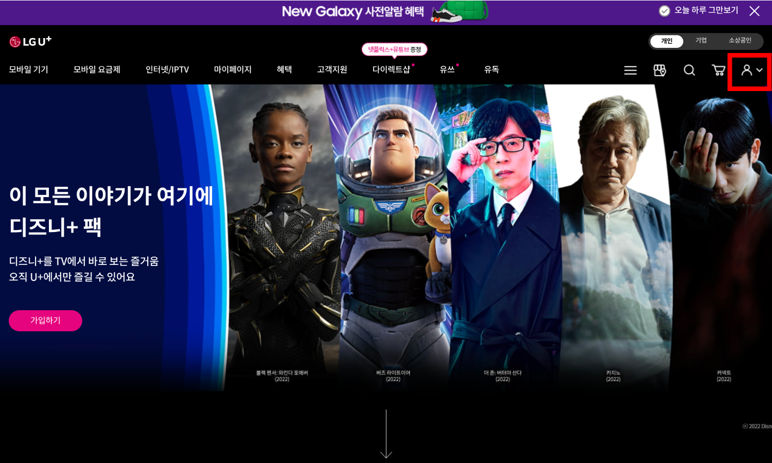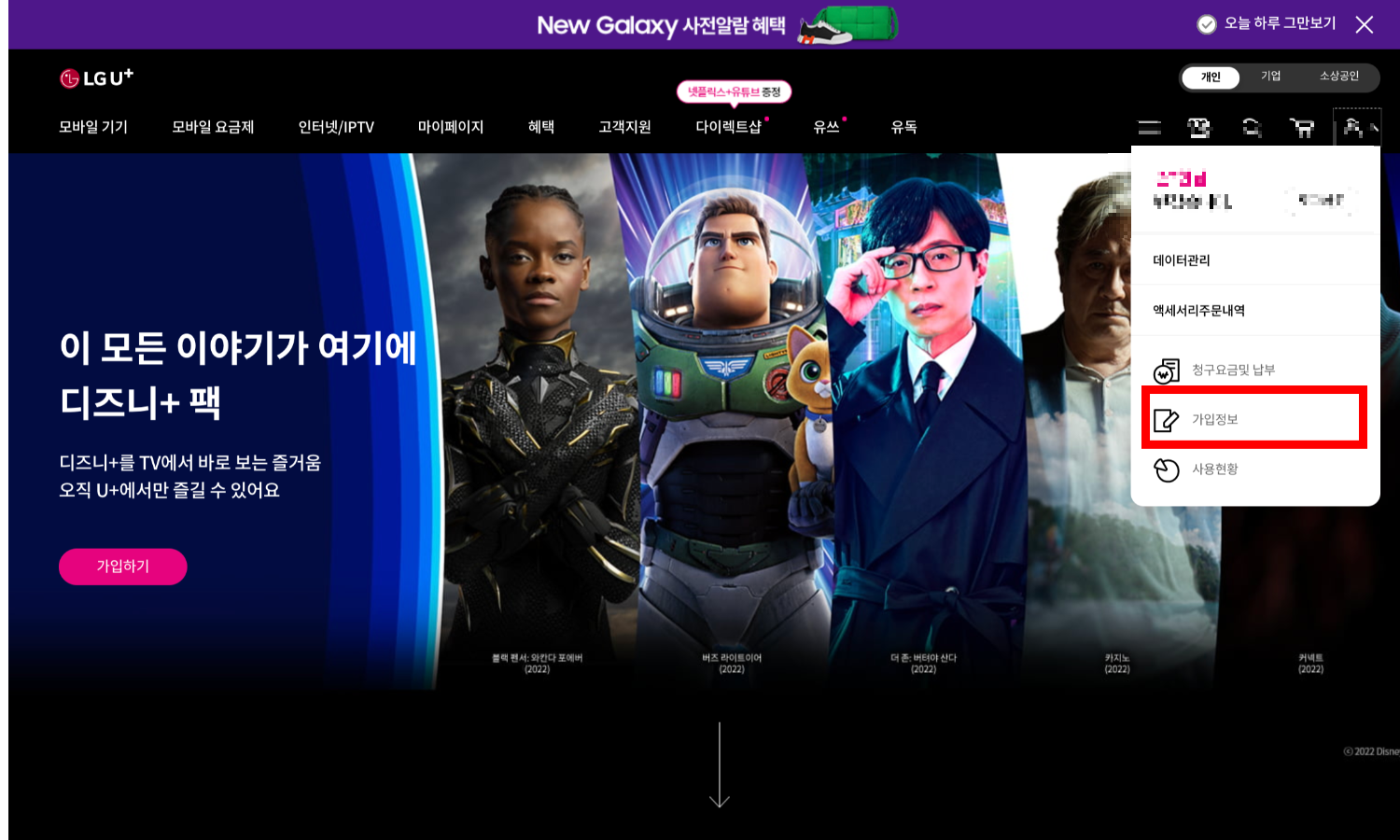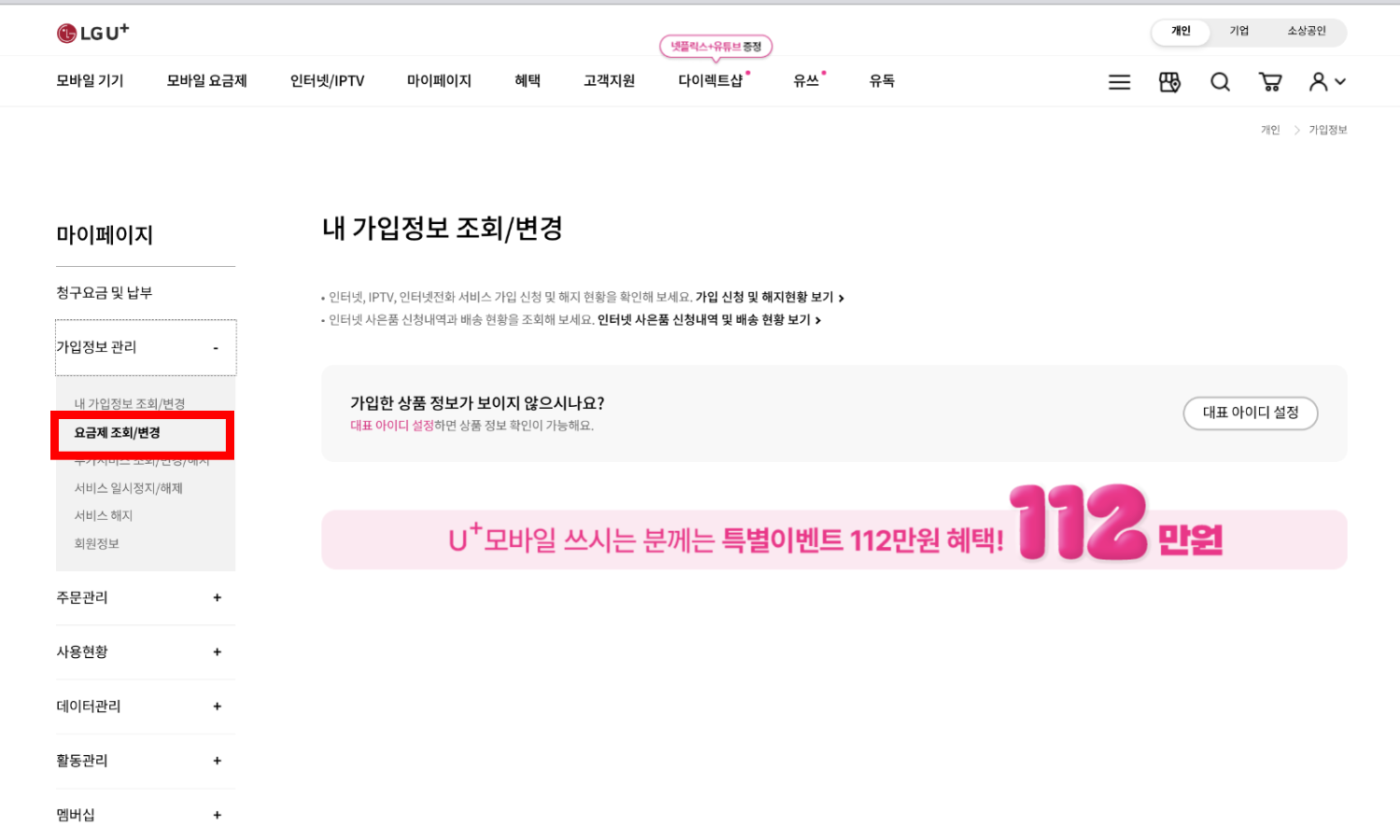 본인의 요금제 조회는 LG유플러스 홈페이지에서 로그인 후 우측 사람 이미지를 클릭하십니다. 그렇게 되면은 가입정도라는 카테고리가 나오는 데 클릭하시면 됩니다.