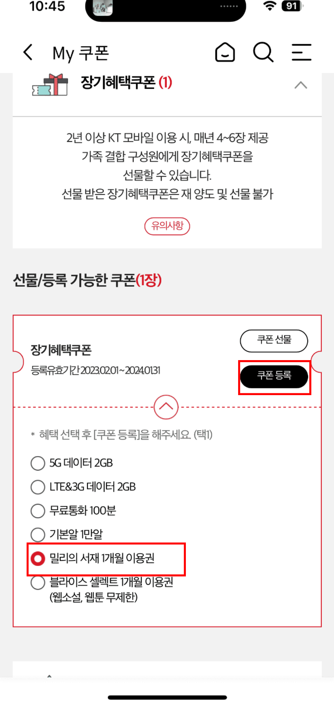 그러면 아래 장기 혜택 쿠폰이 있습니다. 아래 보시면 쿠폰이 있고요. 쿠폰을 체크하시고, 쿠폰 등록을 누르시면 새로운 창으로 이렇게 넘어갑니다.