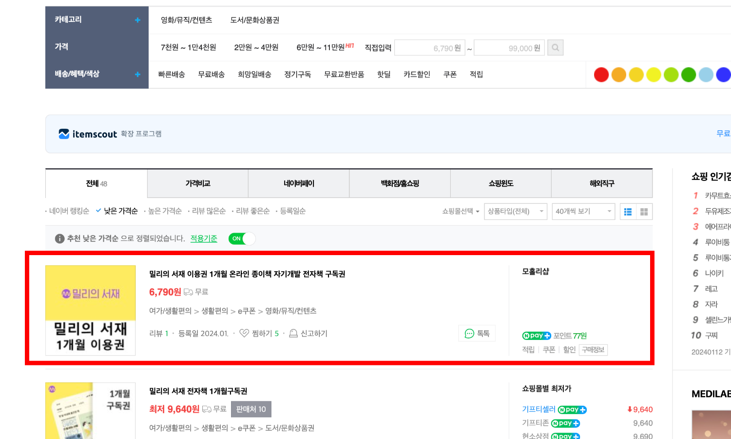 먼저 네이버 검색 창에 밀리의 서재 구독권을 검색합니다. 그리고 최저가로 나열을 하시고요. 월간 구독이 6,790원짜리가 보이긴 하는데, 이건 리뷰수가 거의 없어서 확인이 필요할 듯합니다.