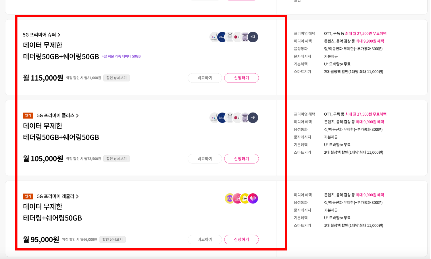 OTT서비스의 대홍수 속에서 통신사들도 구미가 당기는 요금제들을 내놓고 있습니다. 밀리의 서재랑 티빙을 이미 이용 중인 고객이라면, 조금 더 비싼 요금제로 갈아타면서 두 서비스가 포함되면 이득이기 때문이죠.