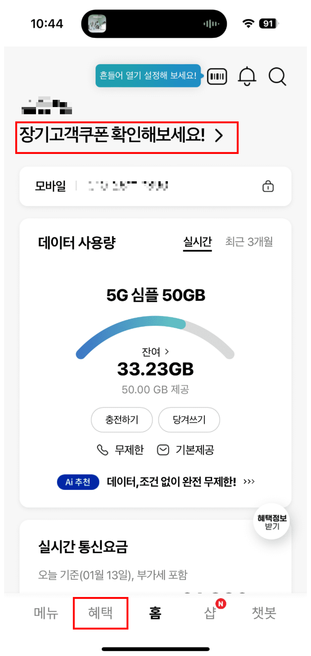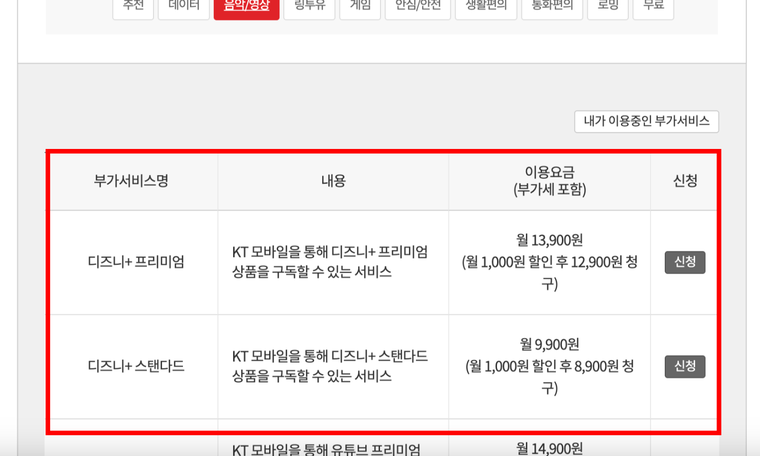 아주 혹시나, 이미 해당하는 요금제를 사용하실 수도 있으니 아래와 같이 요금제를 확인해 보시길 바랍니다. 그리고 할인 전 9만 원대의 요금제를 사용 중이시라면 요금제 변경을 통한 무료 구독도 고려해 보세요.
