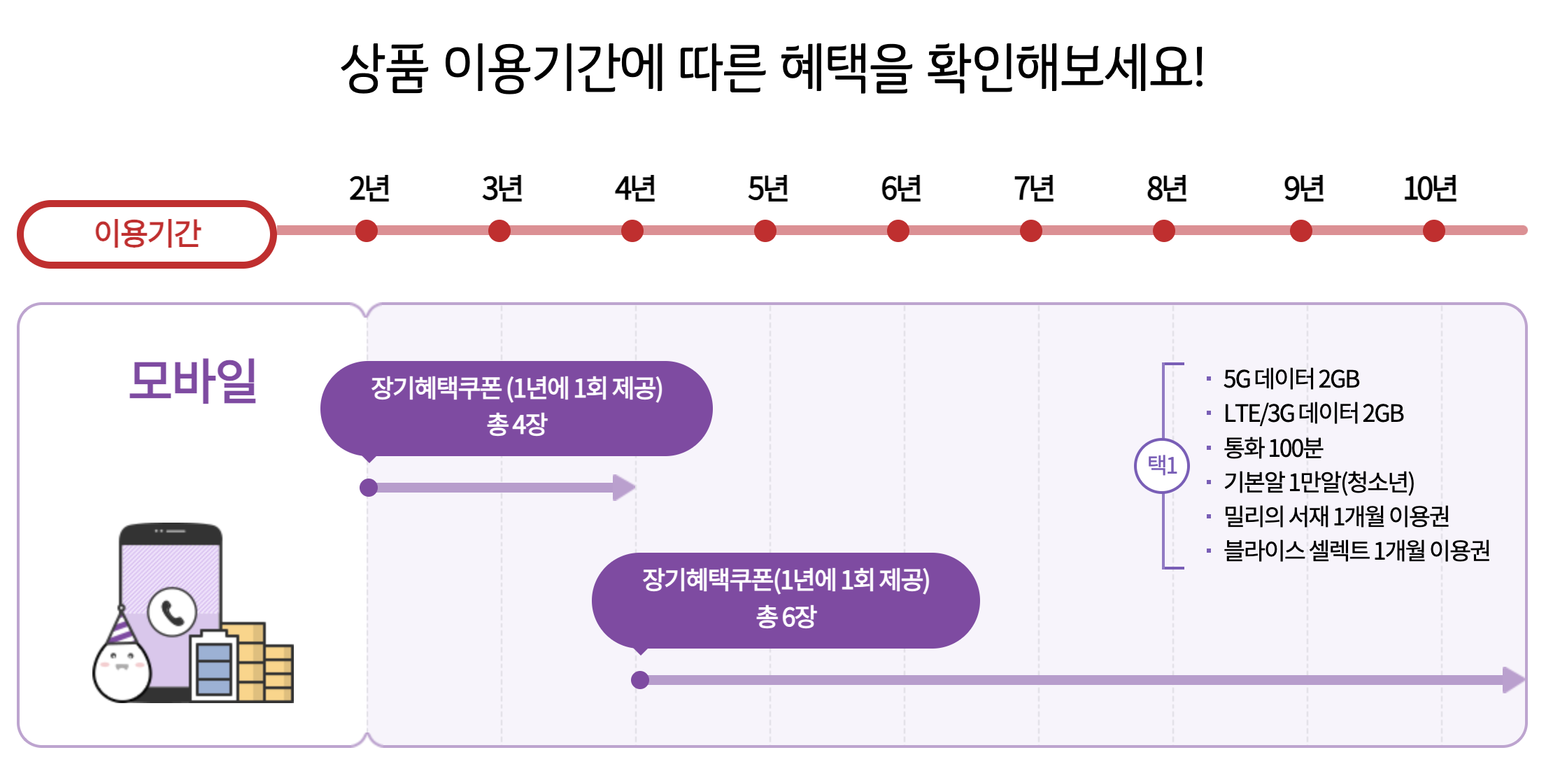 대부분이 모르시는 꿀팁 중의 꿀팁입니다. KT를 2년 이상 사용하시면 장기 혜택 쿠폰이 연 4회 이상 발급됩니다. 아래 기간과 기간에 따른 연간 쿠폰 발급이 적혀 있습니다.