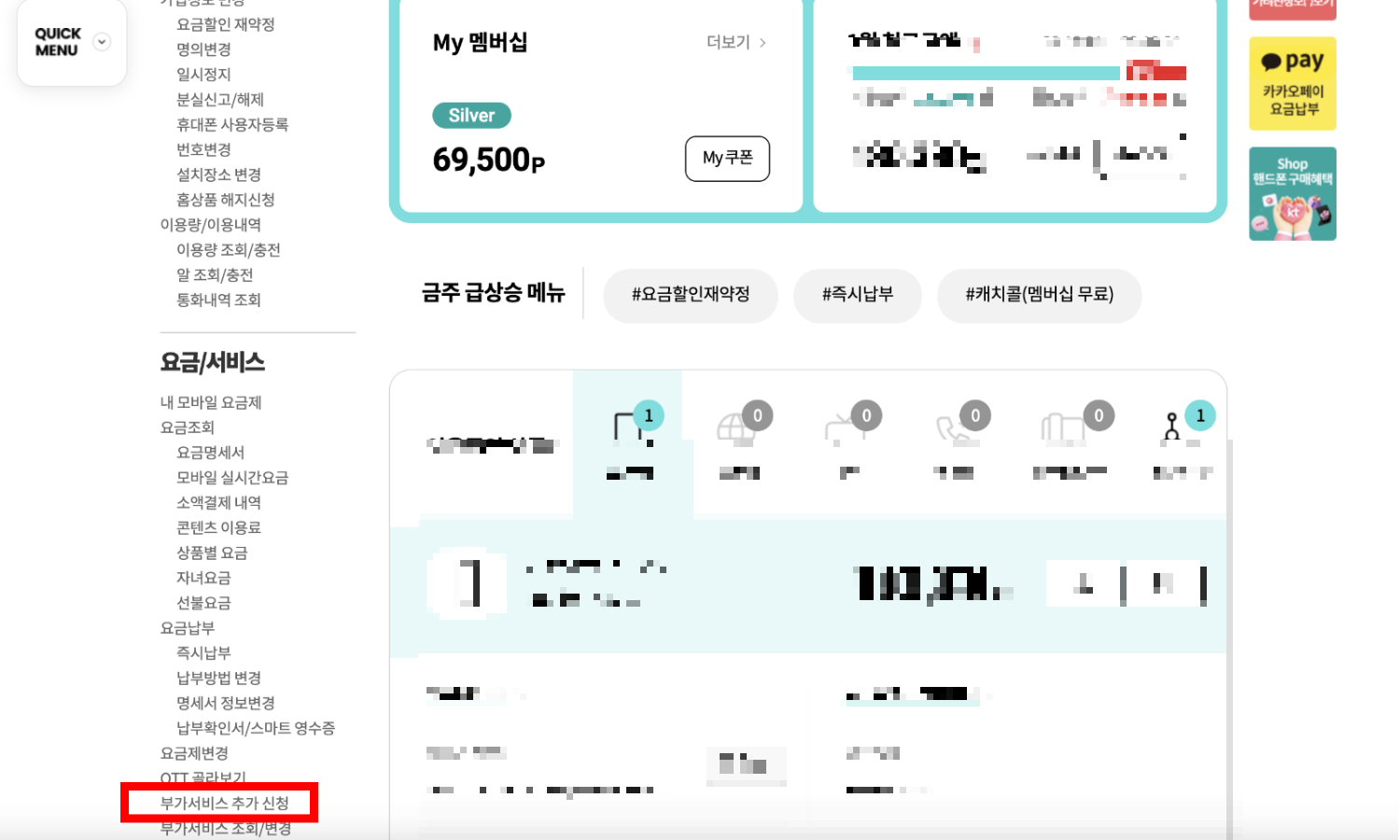 이렇게 로그인하신 후 좌측 아래 부가서비스 추가 신청을 클릭하시면 됩니다. 무수히 많은 부가서비스들이 나올 텐데 'Ctrl + F' 혹은 스크롤다운을 통해 밀리의 서재 항목을 찾으시면 됩니다.