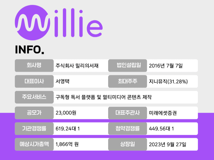 전 웅진씽크빅 대표이사였던 서영택 대표가 설립하였고, 23년 7월 기준으로 국내 디지털 독서 플랫폼 중 단연 1위인 약 14만 원권의 책을 읽을 수 있습니다.