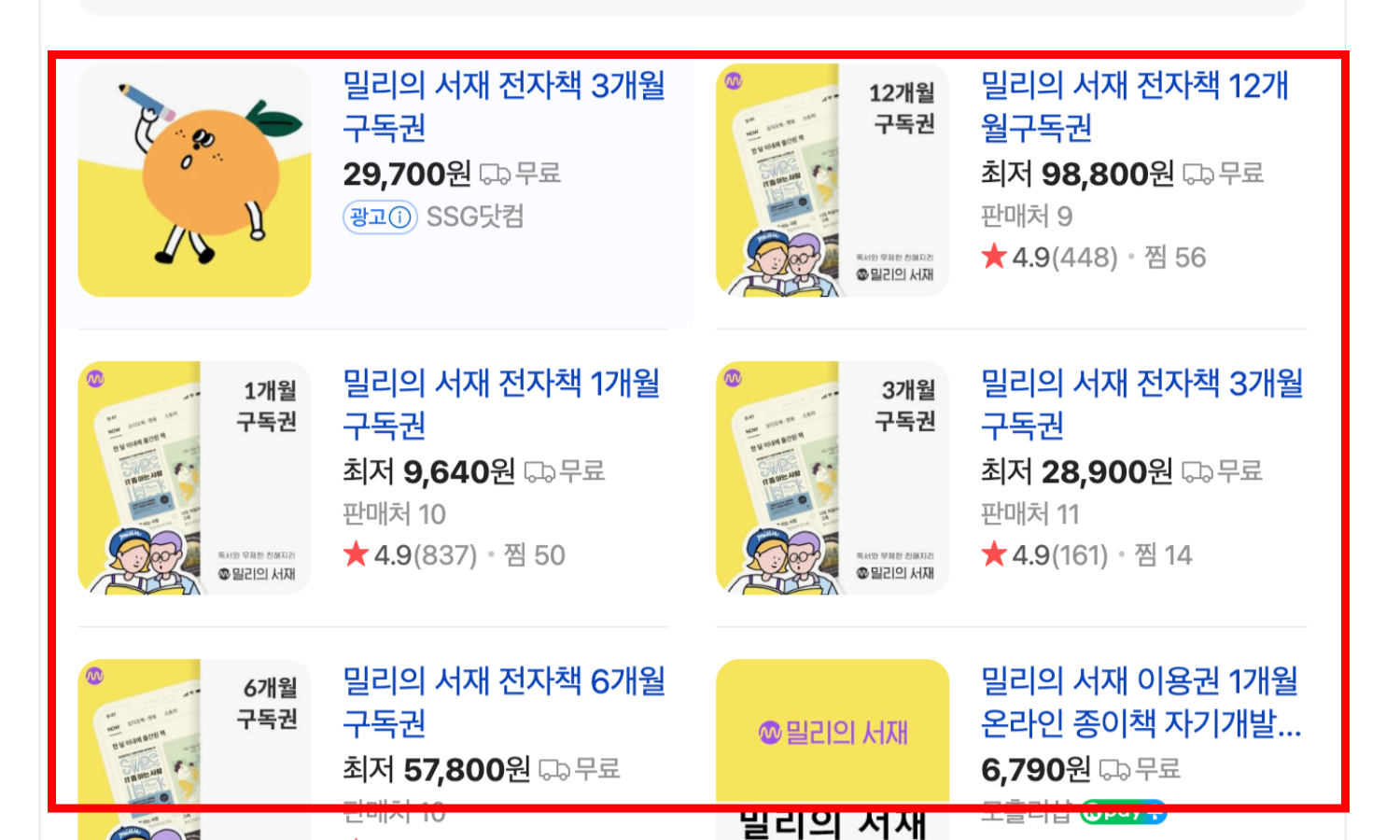 타 사이트 비해 밀리의 서재는 네이버 스마트 스토어를 활용하시는 게 가장 좋다고 판단이 듭니다.