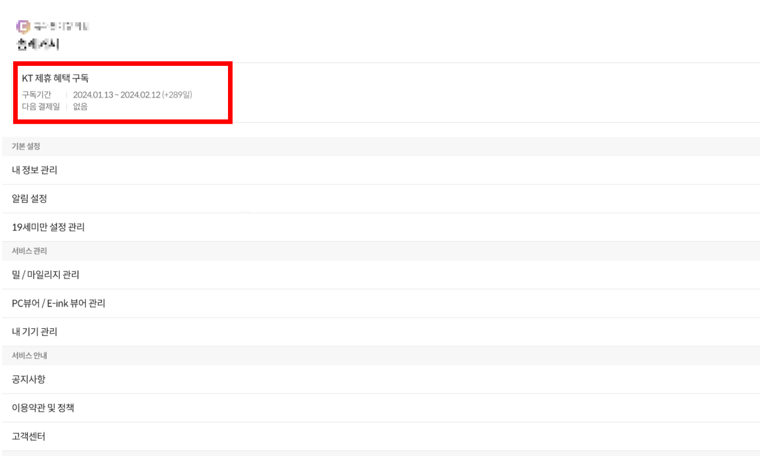 구독시작하기를 누르면 당일부터 구독이 시작됩니다. 저는 그전에 쿠폰을 통해 구독하고 있었는데, 장기이용 혜택 먼저 구독됩니다. 혹시나 실수로 끄셨다면, '관리 -> 구독관리 -> 혜택/결합상품 이용'에서 확인할 수 있습니다.