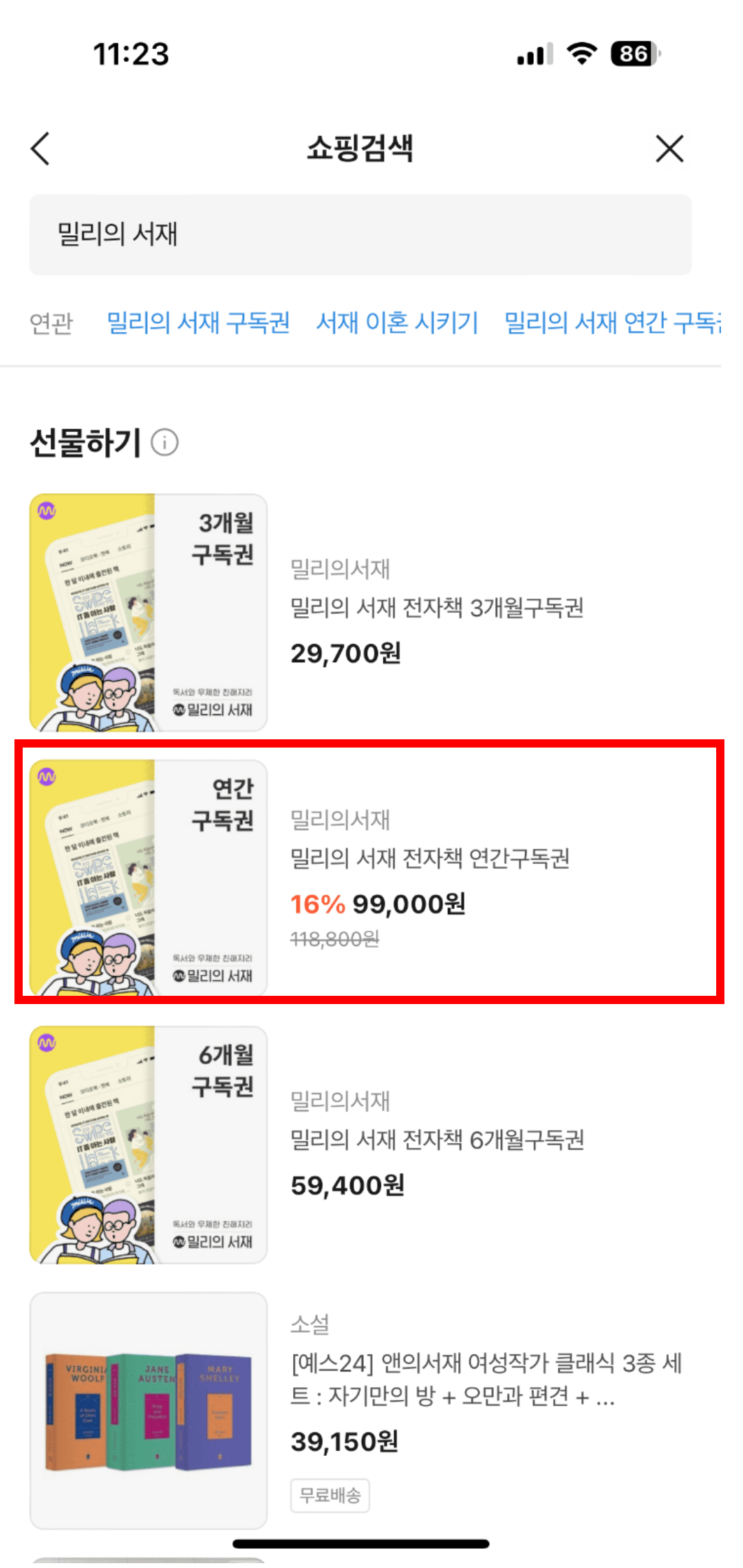 구매는 아래 메뉴단에서 쇼핑을 클릭하시고, 검색 창에 '밀리의 서재'를 검색하시면 이용권들이 나옵니다. 연간 구독권은 16% 할인 중이네요. 사실 거의 연중 어떤 플랫폼에서는 1년 구독권을 99,000원으로 팝니다.