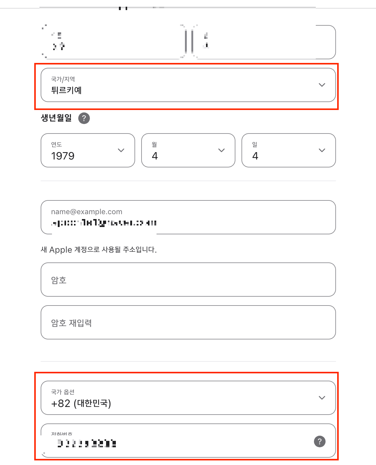 Apple 계정 생성을 누르시구요. 가장 우측처럼 정보를 기입합니다. 대신에 유의할 사항은 국가 지역은 튀르키예로 하시고, 밑에 전화번호 위의 국가는 대한민국으로 해야 됩니다. 전화번호로 인증해야 되기 때문입니다.