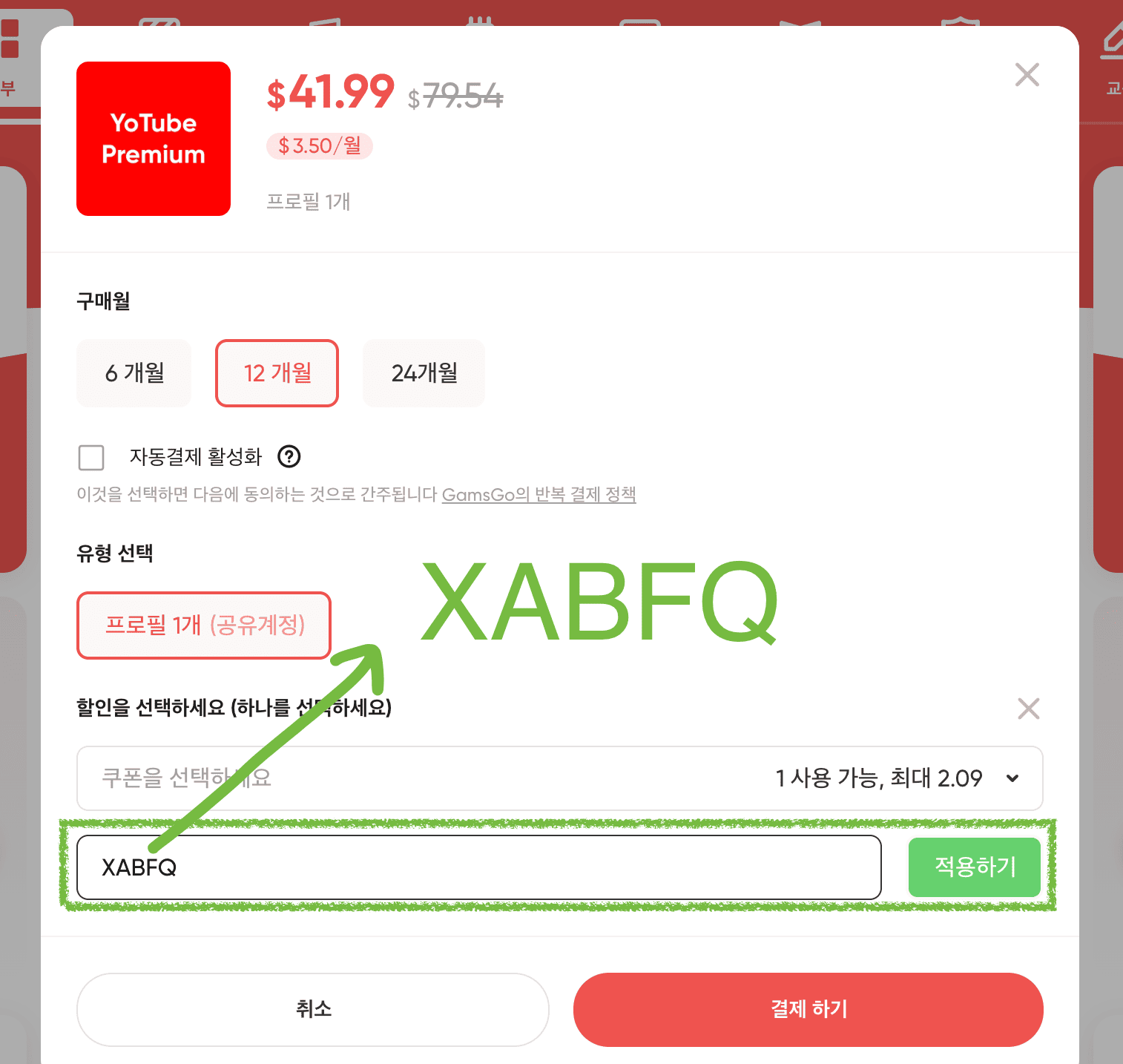 로그인 후에 메인페이지에 있는 유튜브 지금 구매하기를 누르시면 됩니다. 구독하실 때 할인코드, XABFQ를 기입하시면 추가 할인이 들어갑니다. 6개월, 12개월 중에 하나로 하시는 걸 추천드립니다.