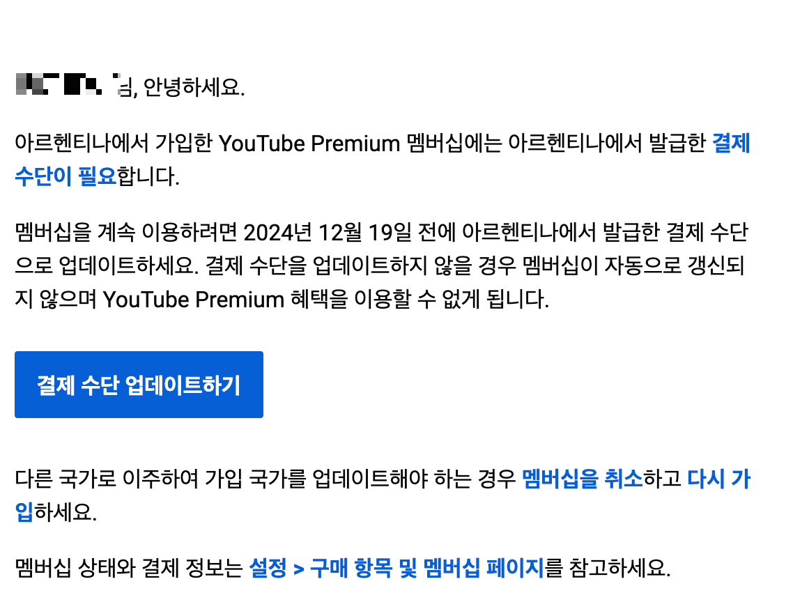 아르헨티나 국적을 가지고 유튜브 프리미엄을 구독한 지 한 4년 정도 된 것 같습니다. 그러다 청천벽력 같이 메일 하나가 도착합니다. 이제 멤버십이 갱신되지 않는다는 충격적인 소식입니다.