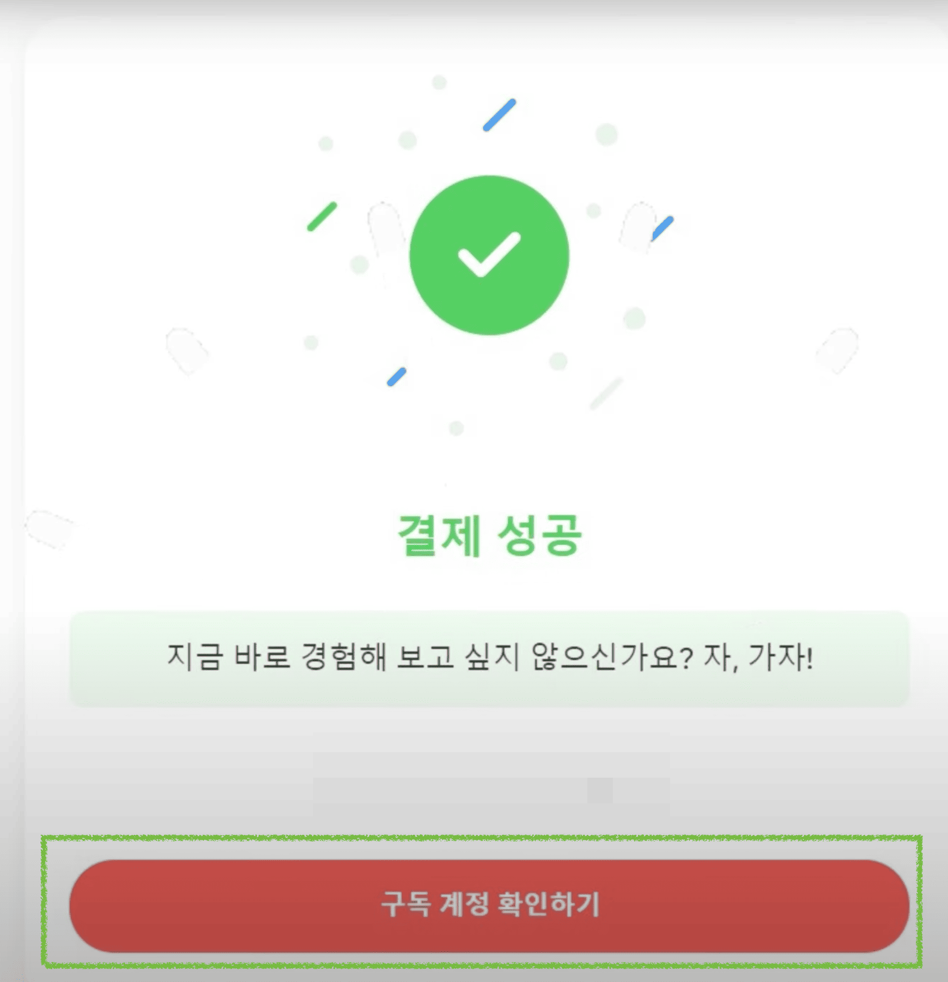 결제를 하게 되면 아래와 같이 결제 성공창이 뜹니다. 바로 밑에 구독계정 확인하기를 누릅니다. 그러면 이메일 주소 기입창이 하나 뜨는데, 여기다가 유튜브 프리미엄 구독을 시작할 주소를 넣으시면 됩니다.