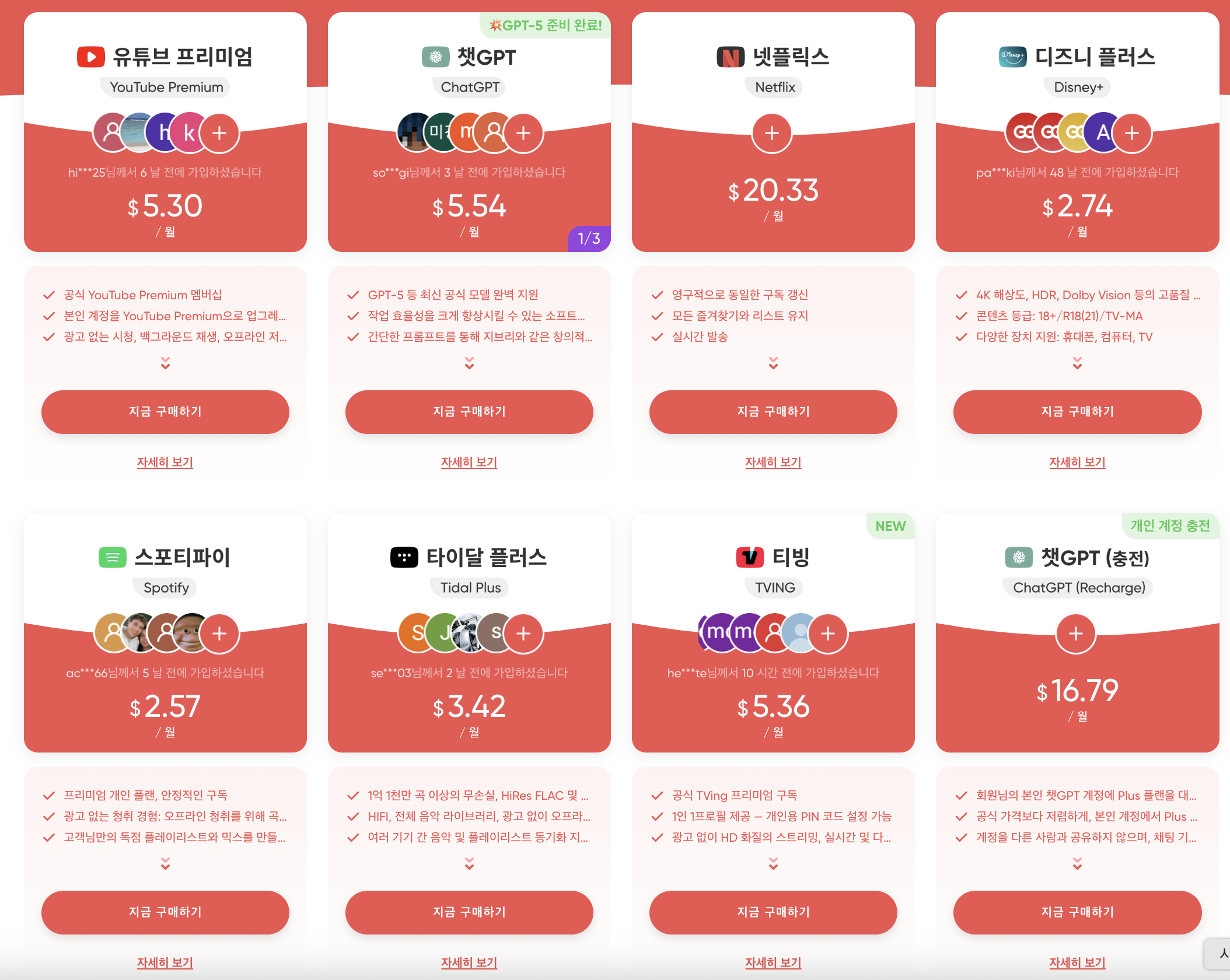 2) 개인 계정 직접 충전 — 유튜브 프리미엄·ChatGPT Plus처럼 가족 플랜이 까다로운 서비스는 고객 개인 계정에 1·3·12개월권을 직접 충전합니다. 비밀번호를 공유할 필요가 없어 보안 부담이 적습니다.