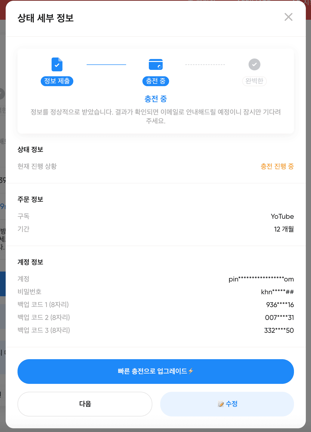 저는 개인적으로 일반 충전 서비스로 신청했고, 영업일 2일 이내 충전이 완료되어 프리미엄 서비스를 즐길 수 있었습니다. 어차피 정가보다 훨씬 저렴하니, 2~3일 정도는 기다릴 만합니다.