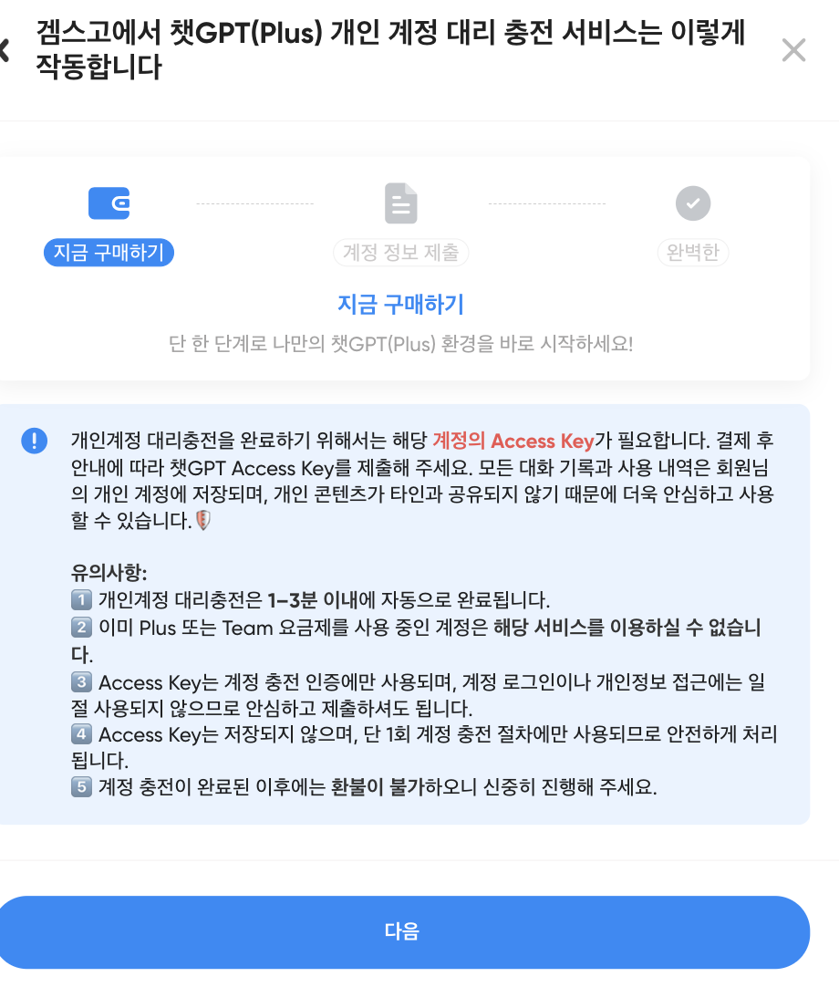 그러다가 이번에 겜스고에서 출시된 서비스인 챗지피티 대리충전을 이용하게 되었습니다. 진심 신세계를 경험했습니다. 다공유 계정형태의 저가 구독이 아니라, 그냥 제가 사용하고 있던 계정에 충전을 해주시는 형식이더라구요.