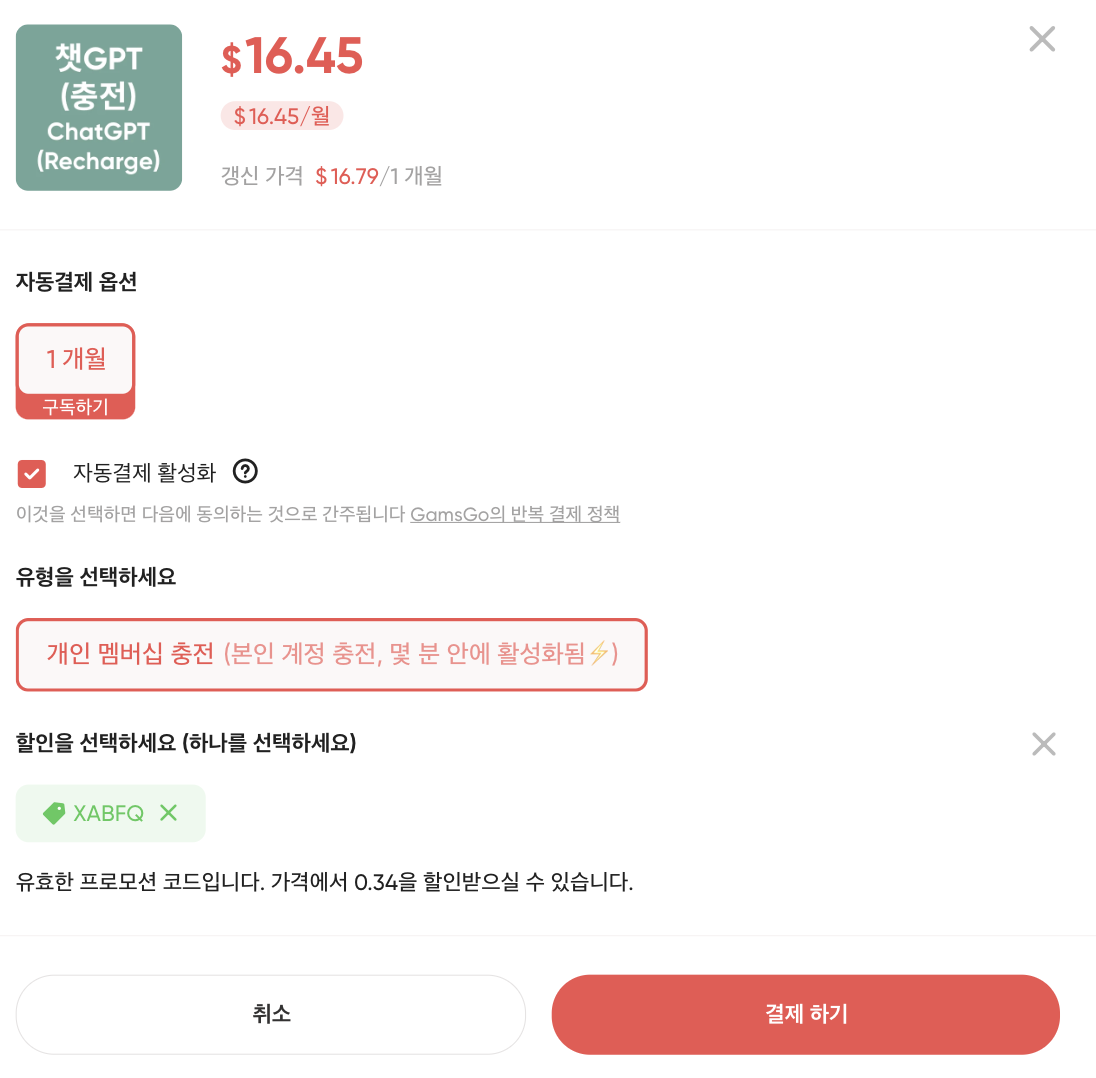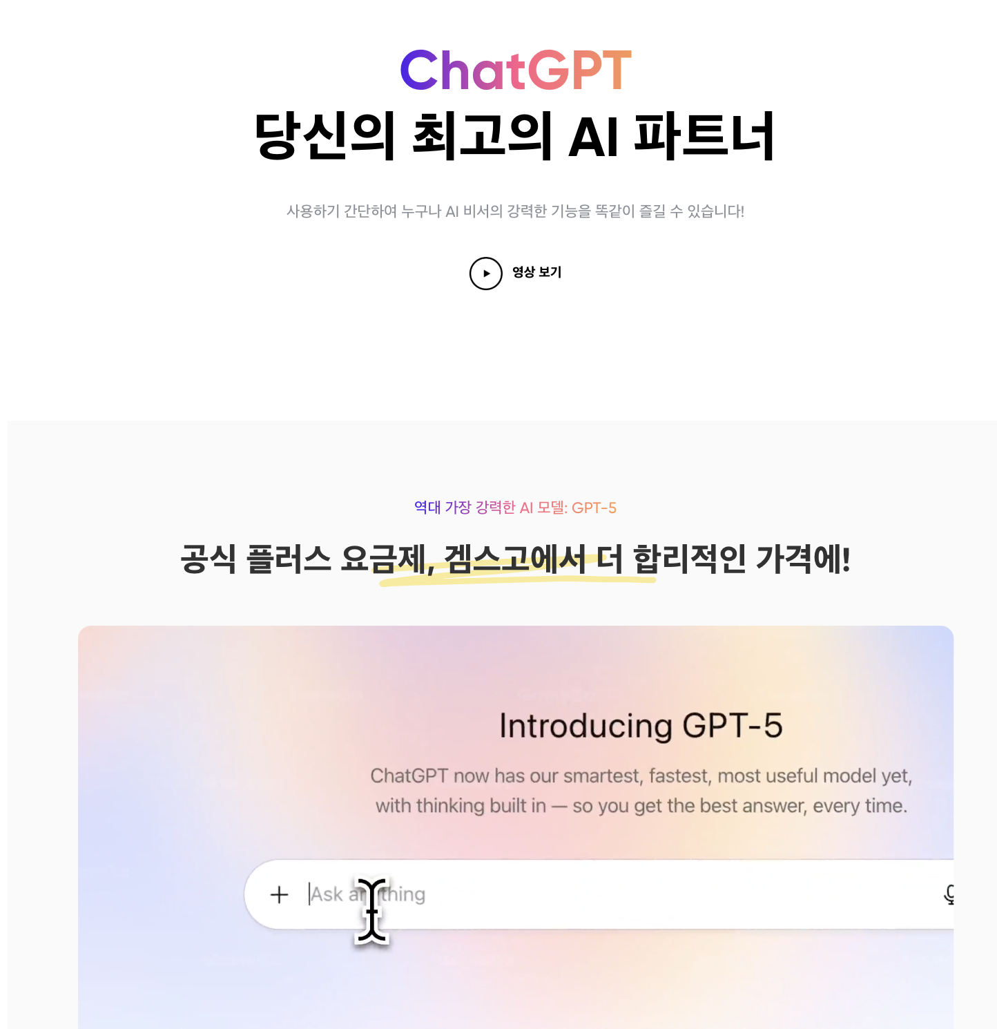 겜스고는 내 계정에 직접 유료 플랜을 충전해주는 방식이라, 별도의 계정을 새로 만들 필요도 없고 다른 사람과 공유할 필요도 없습니다. 그냥 제가 쓰던 계정 그대로, 챗지피티 플러스를 훨씬 저렴하게 즐길 수 있는 겁니다.