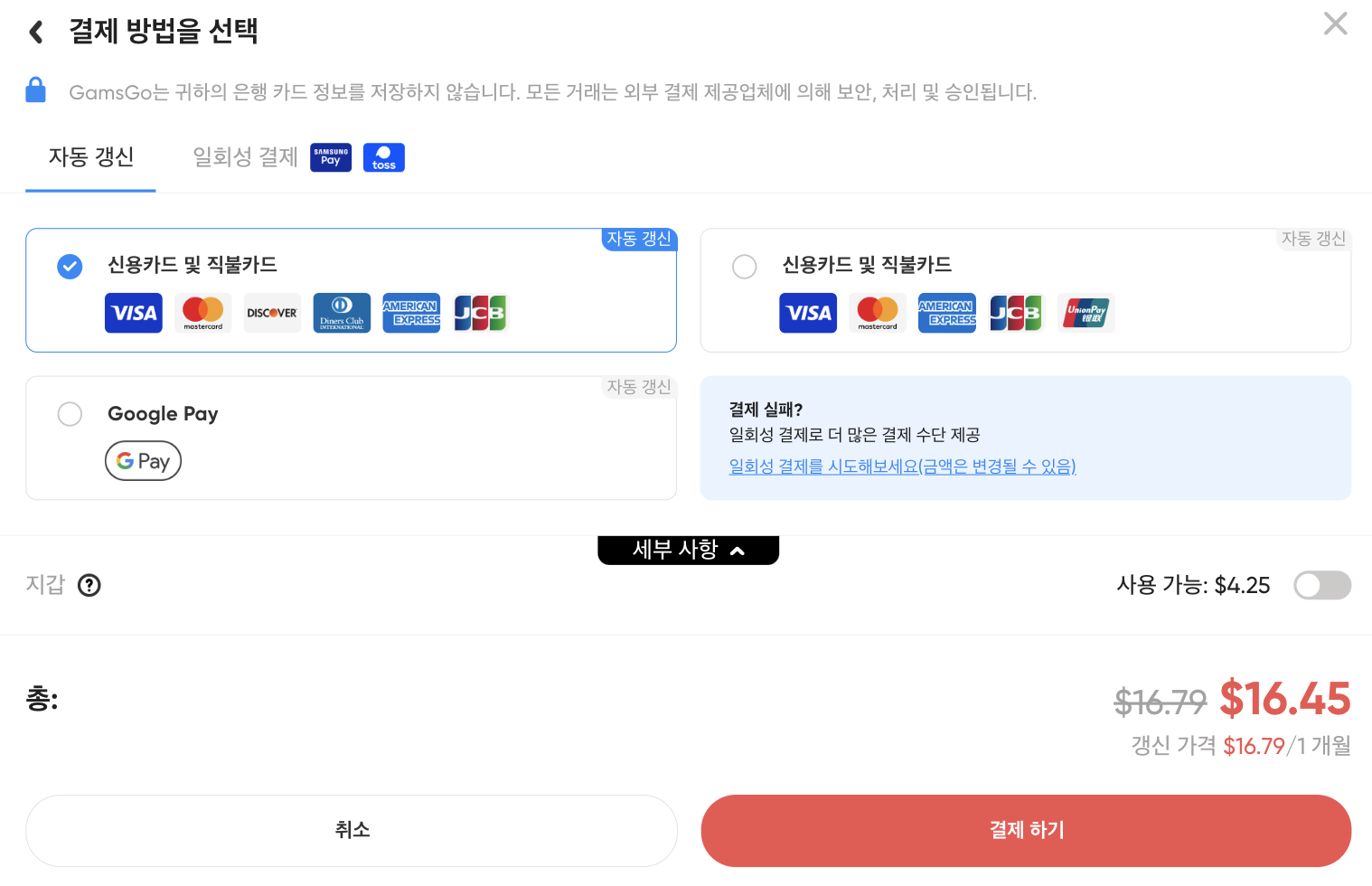아무래도 겜스고의 안정성에 대해 지극히 잘 알다보니, 다른 분들과 다르게 긍정적일 수는 있습니다. 그럼에도 불구하고, 아직 아쉬운 점은 1달 결제 밖에 되지 않아 더 저렴하고 오랜기간 동안 편하게 사용할 수 없다는 점인데요.