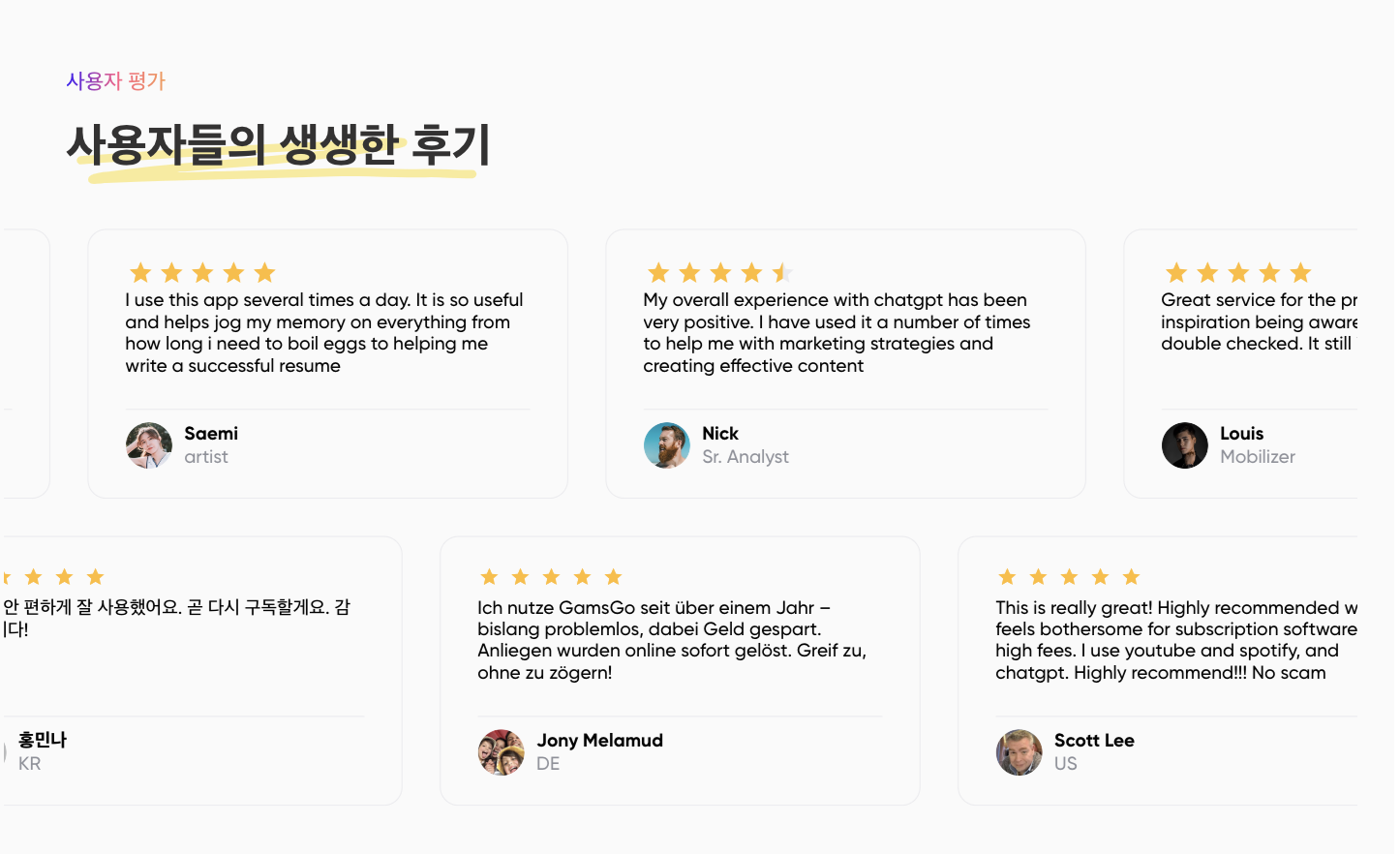 저는 회사 업무 때문에 챗지피티를 매일 쓰는데, 솔직히 정가로 결제하기엔 부담이 컸습니다. 그런데 겜스고 대리충전을 쓰면서는 ‘아, 이 정도 가격이면 꾸준히 쓸 수 있겠다’라는 생각이 들더라고요.