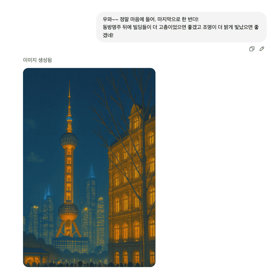 예전에 다녀온 상하이 여행 사진을 지브리 스타일로 바꿔보려고 합니다. 다시 말씀드리지만, 한 번에 만족스러운 결과를 얻는 것이 아니라 여러 번 수정과정을 통해서 원하는 사진을 얻어야 됩니다.
