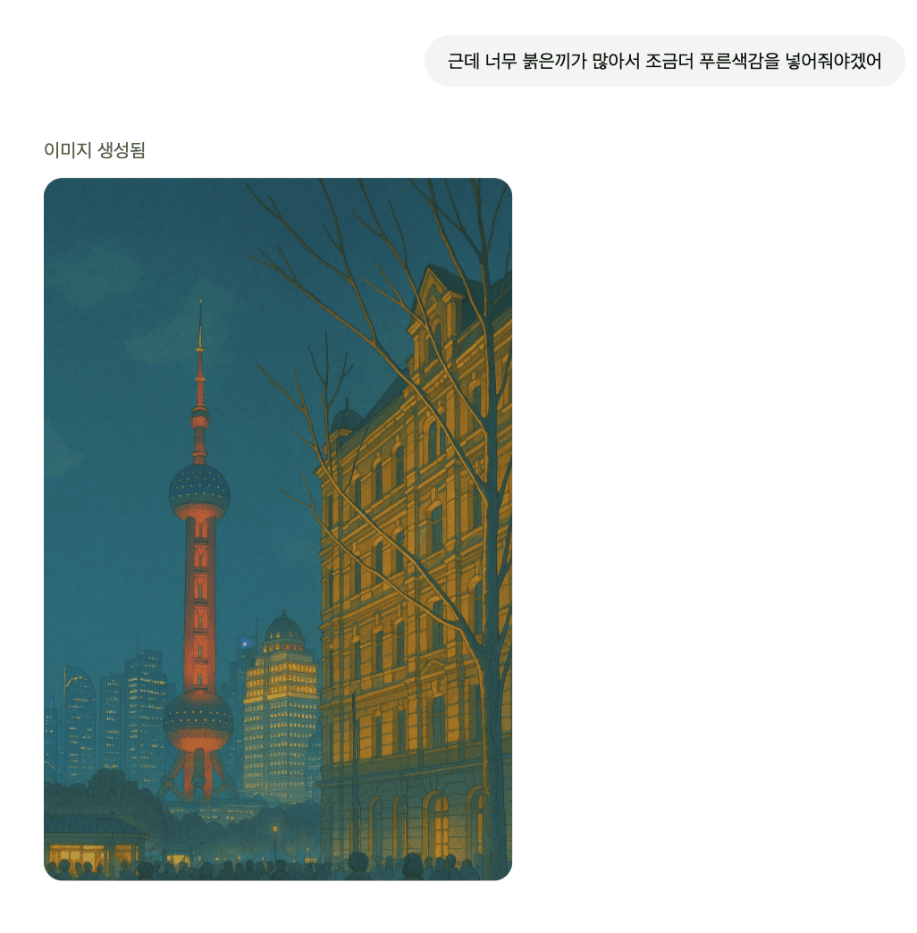 중국 여행이다 보니, 강렬한 색감을 요청하였습니다. 풍경사진이라 더 애니메이션 느낌을 담기 위해, 라인 간소화와 감성적인 느낌을 요청하였습니다. 이렇게 요청 후, 이미지를 받으니 느낌을 아주 잘 살린 그림으로 바꿔줍니다.