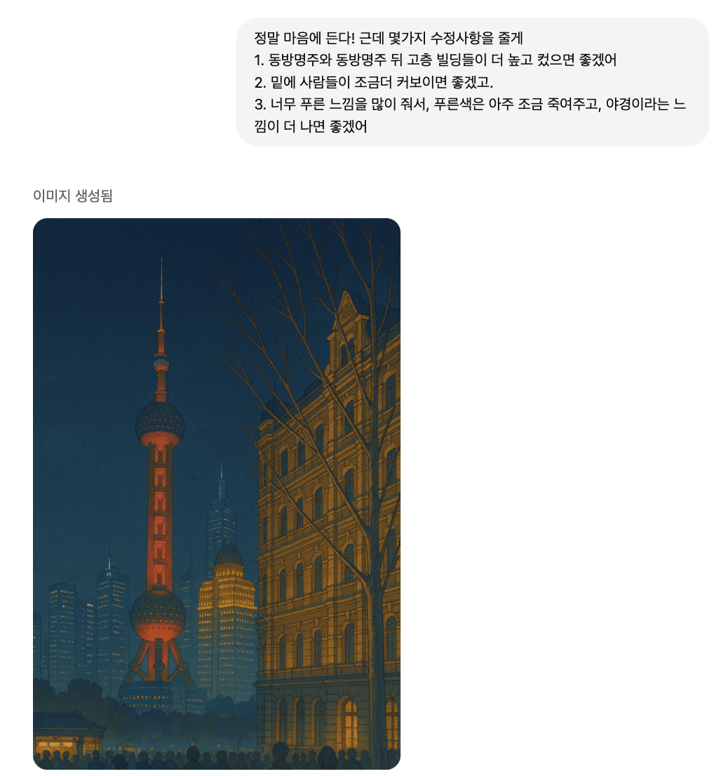 그리고 몇 번의 수정을 거칩니다. 푸른색이 또 많이 들어가 있으니 야경의 느낌을 내기 위해 푸른색을 조정해 달라고 하고, 빌딩의 높낮이도 수정해 줍니다.