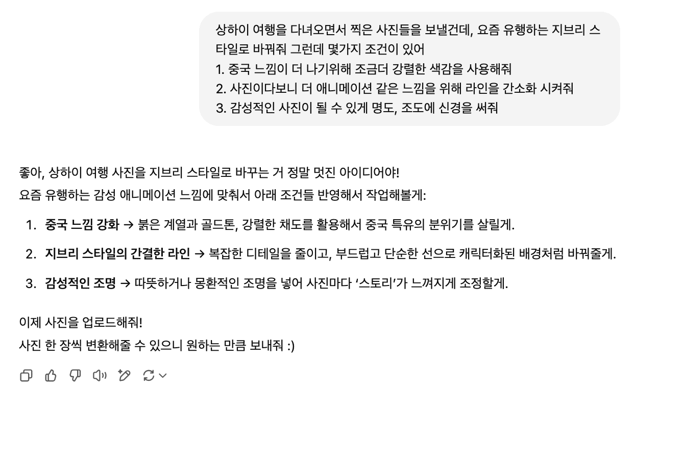 상하이 여행을 다녀오면서 찍은 사진들을 보낼 건데, 요즘 유행하는 지브리 스타일로 바꿔줘 그런데 몇 가지 조건이 있어