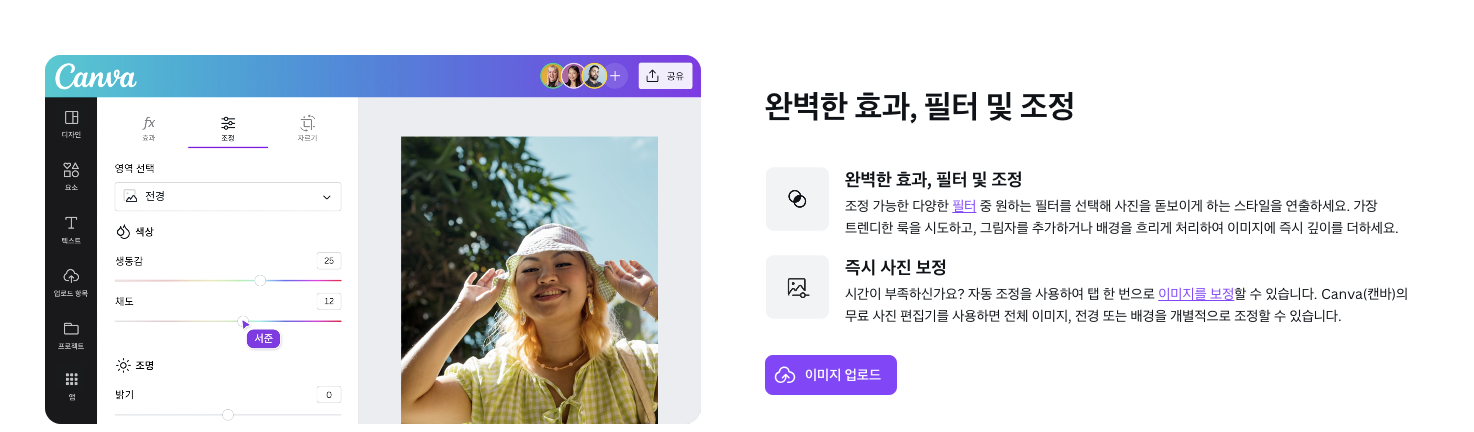 캔바는 이미지 보정 기능도 강력합니다. 노출, 대비, 채도, 온도, 흐림 효과 등을 세밀하게 조정할 수 있고, AI가 자동으로 최적의 밝기와 색감을 추천해줍니다.