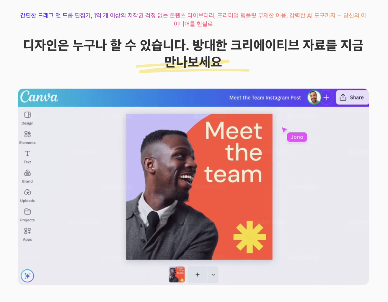 Canva(캔바)는 이런 문제를 해결해준 최고의 도구이지만, 매달 결제되는 Pro 요금이 부담스럽습니다. 저 역시 매달 나가는 캔바 결제 내역을 보며 고민하다가, 결국 답을 찾았습니다. 바로 겜스고(GamsGo)입니다.