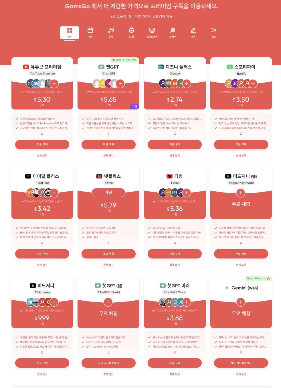 네. ChatGPT, Midjourney, Adobe, Disney+, Netflix 등 모든 구독을 겜스고에서 제공합니다.