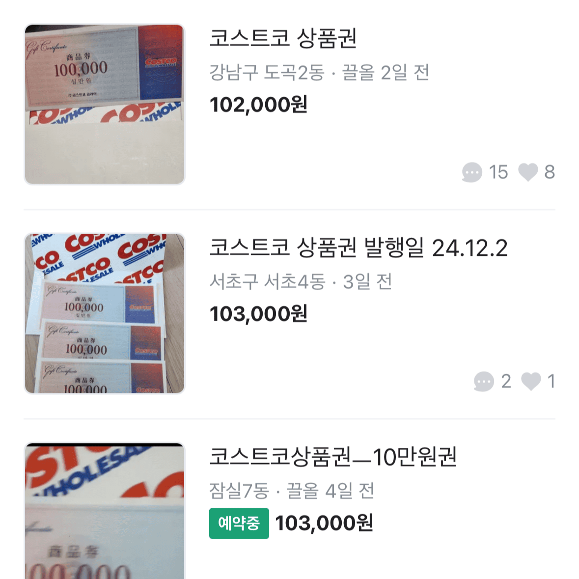 코스트코 상품권은 10만 원부터 시작합니다. 당근마켓에서의 경우 보통 10만 3천 원 혹은 10만 5천 원 정도에 거래되고 있습니다. 다른 백화점 및 마트 상품권과 다르게 웃돈을 주고 거래되는데요.
