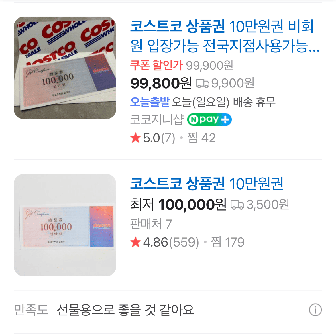 이는 회원권의 비용을 일부 포함하고 있다고 보면 되겠습니다. 코스트코 상품권은 쉽게 구할 수 있습니다. 코스트코 매장 근처에 살고 계신 분들은 10만 원에 사다가 10만 5천 원에 파는 상품권깡으로 부업으로 하시는 분들이 많기 때문입니다.