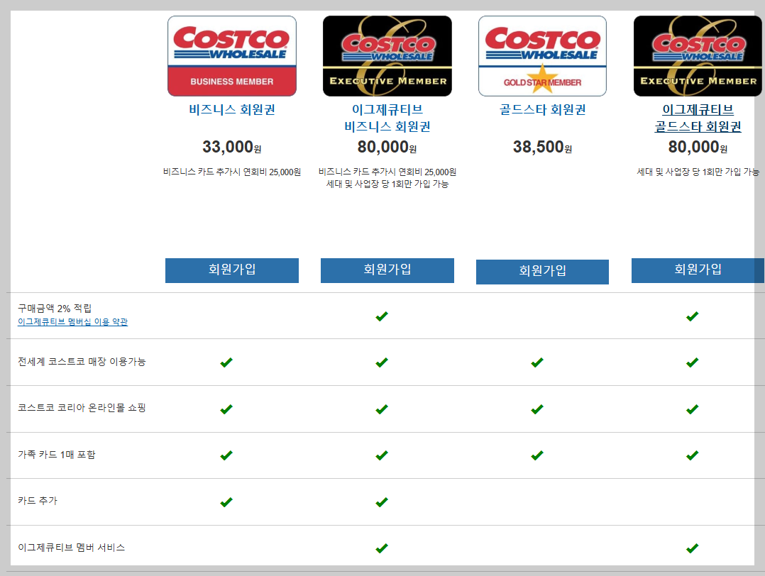 근데 사진을 보니 이그제큐티브 회원권이 있습니다. 이는 구매 적립이 되냐 안되냐의 차이입니다. 이는 연간 구매 금액에 따라 유리하거나 불리할 수 있는데, 자세한 건 아래 글에서 확인하시길 바랍니다.