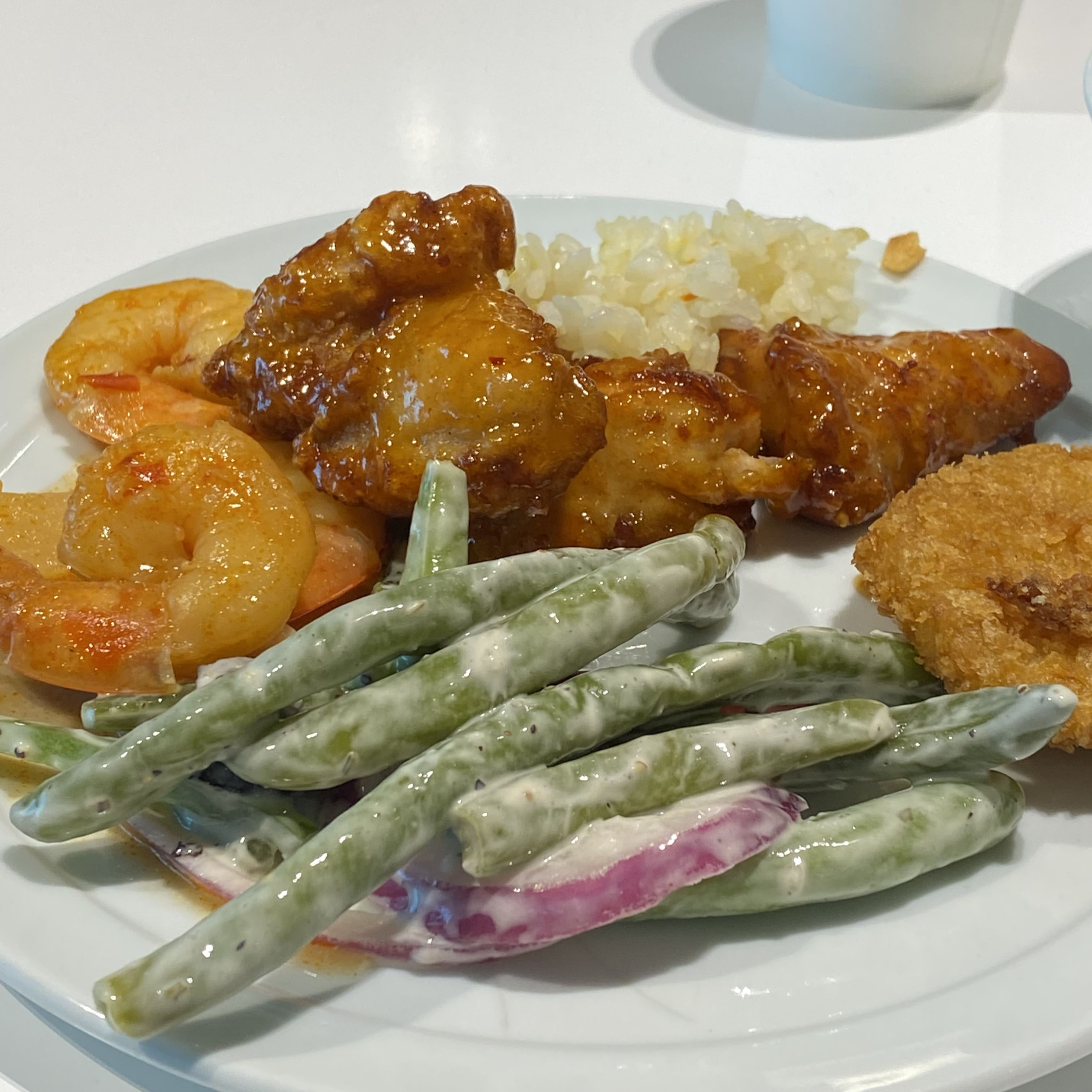 샐러드 바에는 신선한 채소와 연어 샐러드가 준비되어 있어 가볍게 시작하기 좋습니다. 핫푸드 섹션에는 찹스테이크, 차돌된장찌개, 떡볶이 등 다양한 한식 메뉴가 제공됩니다.
