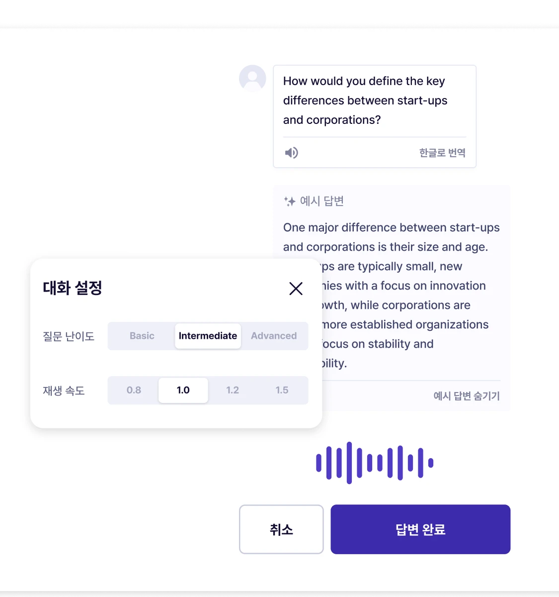 - 문법 및 표현 교정: 대화 중 실시간으로 문법 오류를 잡아주고 자연스러운 대안을 제시